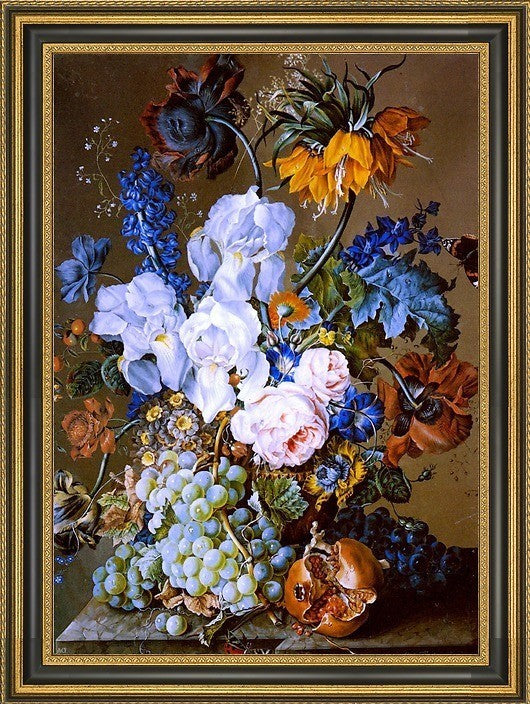 18" x 27" Anton Hartinger An Elaborate Floral Still Life with a Pomegranate, Grapes and Butterflies framed premium canvas print reproduced to meet museum quality standards. Our Museum quality canvas prints are produced using high-precision print technology for a more accurate reproduction printed on high quality canvas with fade-resistant, archival inks. Our progressive business model allows us to offer works of art to you at the best wholesale pricing, significantly less than art gallery prices, affordable to all. This artwork is hand stretched onto wooden stretcher bars, then mounted into our 3 3/4" wide gold finish frame with black panel by one of our expert framers. Our framed canvas print comes with hardware, ready to hang on your wall. We present a comprehensive collection of exceptional canvas art reproductions by Anton Hartinger.