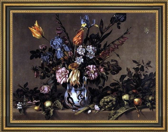 21" x 28" Antonio Ponce Still-Life with Flowers, Artichokes and Fruit framed premium canvas print reproduced to meet museum quality standards. Our Museum quality canvas prints are produced using high-precision print technology for a more accurate reproduction printed on high quality canvas with fade-resistant, archival inks. Our progressive business model allows us to offer works of art to you at the best wholesale pricing, significantly less than art gallery prices, affordable to all. This artwork is hand stretched onto wooden stretcher bars, then mounted into our 3 3/4" wide gold finish frame with black panel by one of our expert framers. Our framed canvas print comes with hardware, ready to hang on your wall. We present a comprehensive collection of exceptional canvas art reproductions by Antonio Ponce.