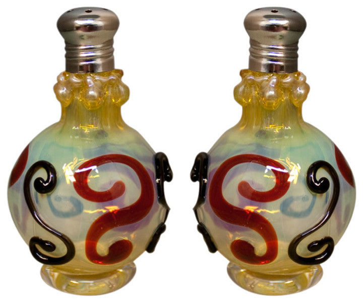 These beautiful hand blown salt and pepper shakers add an elegant touch to any dining table. Available in many colors and designs, each piece is completely unique. Perfect for table decorations or hostess gifts. Please note each shaker is handmade so there will be slight variances between the shakers you receive and the one pictured.