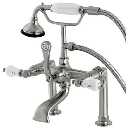 The Vintage deck-mount bathtub filler provides vintage looks combined with outstanding performance and durability. With two easy to operate lever handles, this clawfoot tub faucet features an elephant spout and a traditional telephone style hand shower. Complete the look of your clawfoot tub with this faucet which installs on 7" centers on the rim of the tub. Available in 4 tarnish and corrosion resistant finishes: Polished Chrome, Polished Brass, Oil Rubbed Bronze or Satin Nickel.Solid Brass ConstructionTub Deck Mount with 7" Centers SpreadStandard 1/2" IPS Connection Drip Free 1/4 Turn Ceramic Disc Cartridge Vacuum Breaker Backflow Prevention on Hand ShowerElegant Porcelain Lever Handle 7.0 GPM/26.5LPM Flow Rate at 60PSI