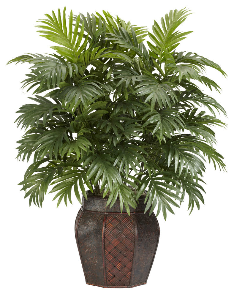 Put down the machete! The Areca Palm with its thick lush leaves is the bane of jungle travel, but perfect for improving the mood of any room. Hailing from Madagascar, the Areca Palm, with its deep rich tropic decor, is sure to delight anyone who dreams of relaxing on a beach surrounded by greenery. Reaching upward at 38 inches and complete with a decorative patterned vase, it''s an elegant addition anywhere.