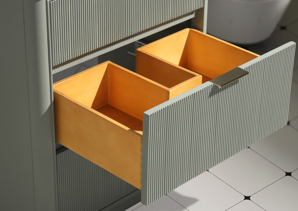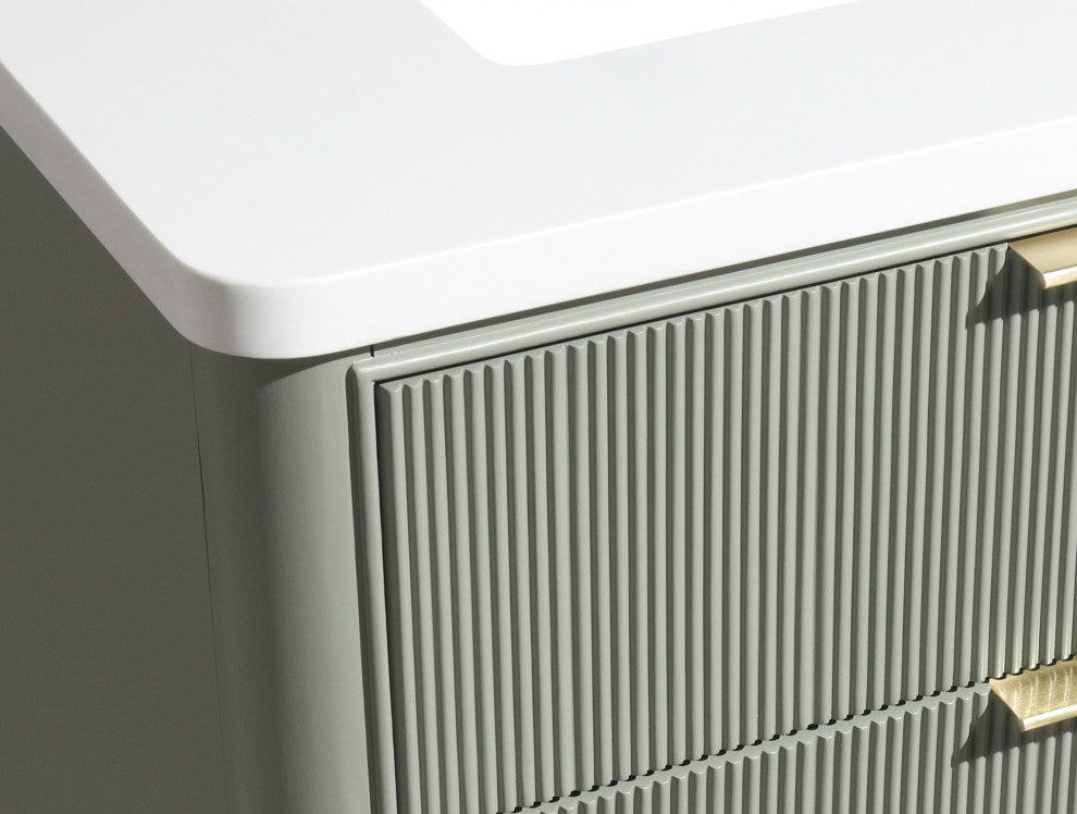 Elevate your bathroom with the 30-inch Aria bathroom vanity, designed to be the centerpiece of your remodel. Expertly constructed from solid wood, this vanity is built to last for years. Three spacious, solid wood dovetail drawers with full-extension glides offer plenty of room for your everyday essentials. The fluted drawer fronts enhance the texture and beautifully highlight the sage finish, making this vanity both functional and stylishSolid wood construction/frameThe vanity is handcrafted and stained by skilled artisans, resulting in a unique finish for each piece.The solid wood dovetail drawer boxes add to the durability and quality of the vanity.The drawers feature soft closing mechanisms and full extension glides for a smooth and quiet closing.The wood is finished to prevent warping, cracking, and to withstand the high humidity levels of bathrooms.Engineered white quartz countertopBeautiful gold pullsThe vanity is finished in sageDimensions: 30" W x 34.50" H x 22" D