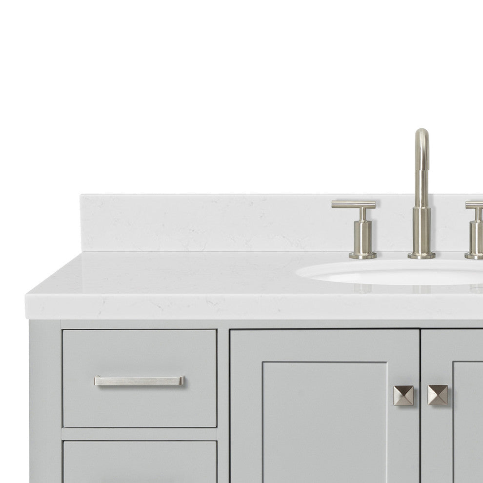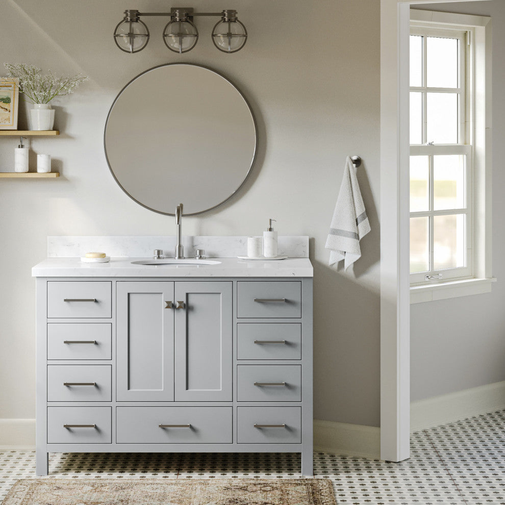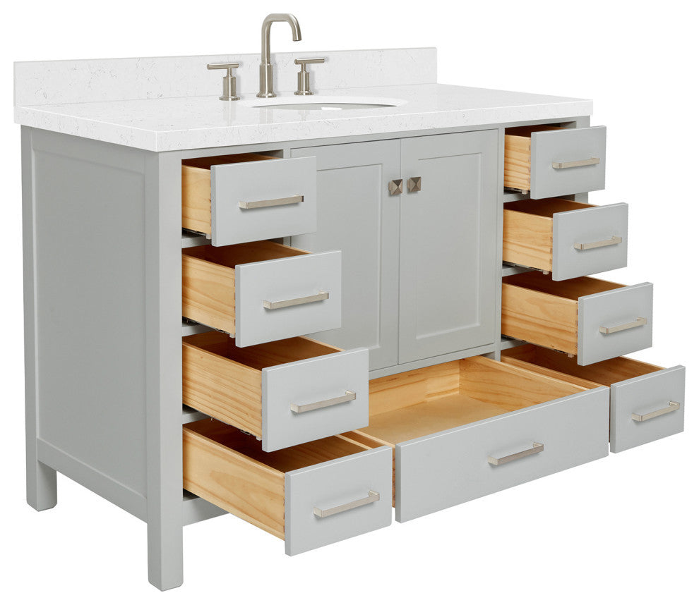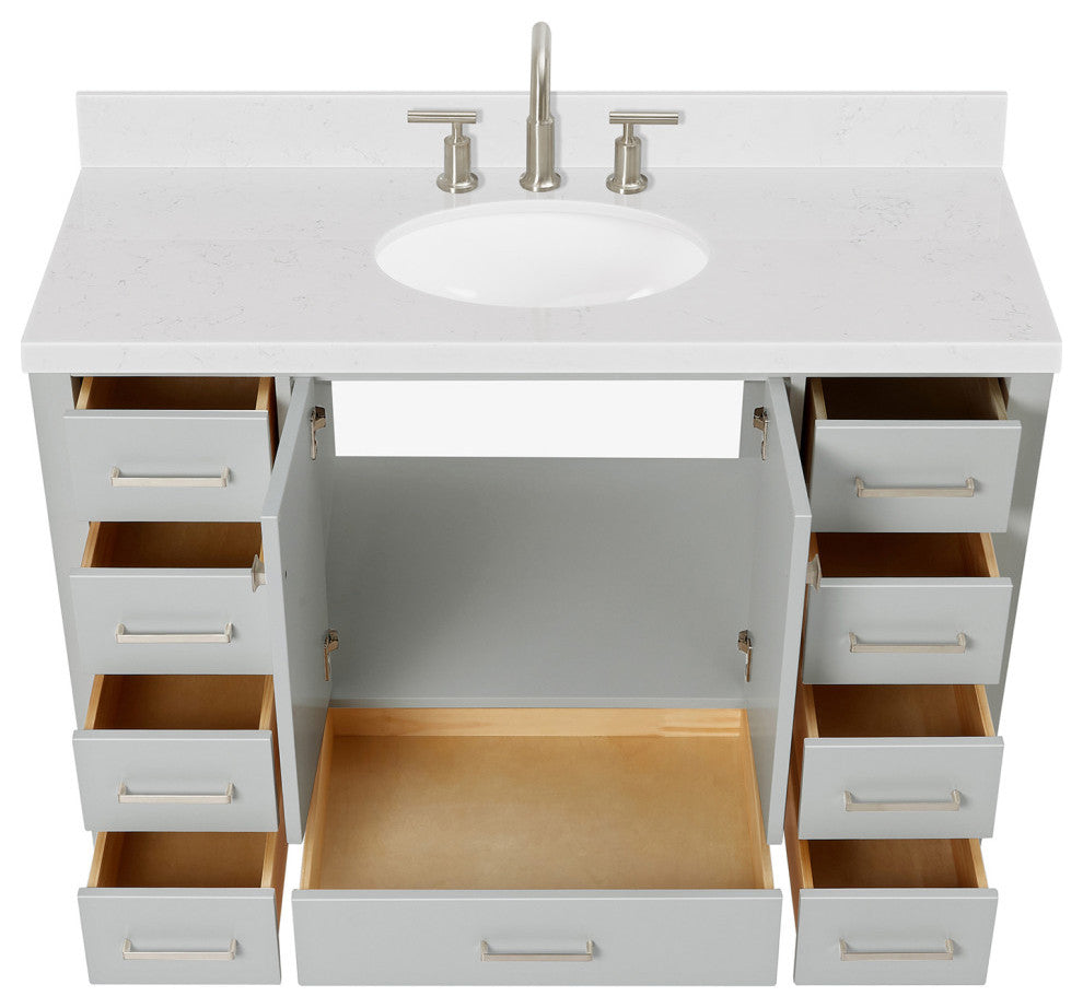 The Cambridge vanity with hardwood frame is the perfect choice for those looking for a contemporary bathroom vanity that will be the center focal point for your updated bathroom. Featuring shaker style doors and flat panel drawers, this bathroom vanity will be sure to highlight any bathroom environment and create a luxurious spa-like experience in anybody�s home.- Covered under Ariel''s 3 year limited warranty- 48.25"W x 22"D x 36"H- Hardwood frame with plywood panel construction for lasting beauty and durability- Grey painted finish- 2 soft-closing doors with adjustable hinges so you''ll never have to worry about hearing a door slam- 9 full extension, self-closing drawers to meet all your storage needs- Dove-tail construction drawer boxes for additional strength and stability