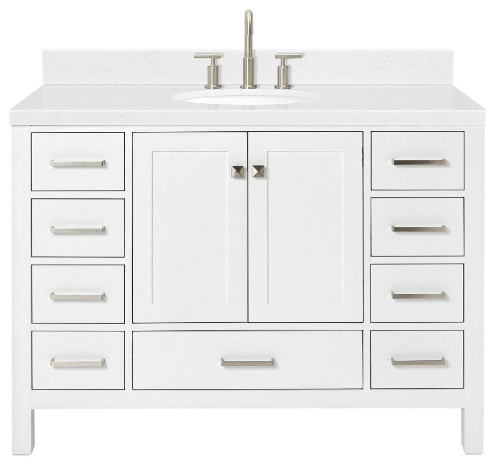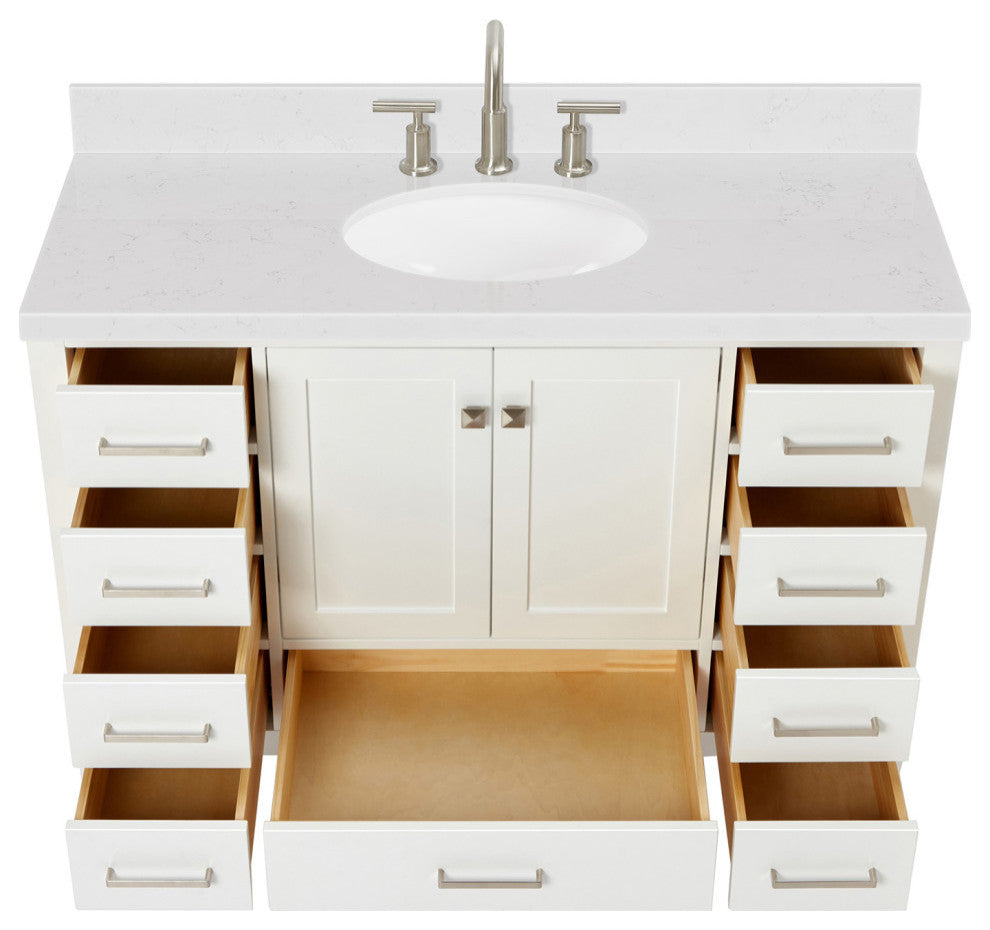 The Cambridge vanity with hardwood frame is the perfect choice for those looking for a contemporary bathroom vanity that will be the center focal point for your updated bathroom. Featuring shaker style doors and flat panel drawers, this bathroom vanity will be sure to highlight any bathroom environment and create a luxurious spa-like experience in anybody�s home.- Covered under Ariel''s 3 year limited warranty- 48.25"W x 22"D x 36"H- Hardwood frame with plywood panel construction for lasting beauty and durability- White painted finish- 2 soft-closing doors with adjustable hinges so you''ll never have to worry about hearing a door slam- 9 full extension, self-closing drawers to meet all your storage needs- Dove-tail construction drawer boxes for additional strength and stability