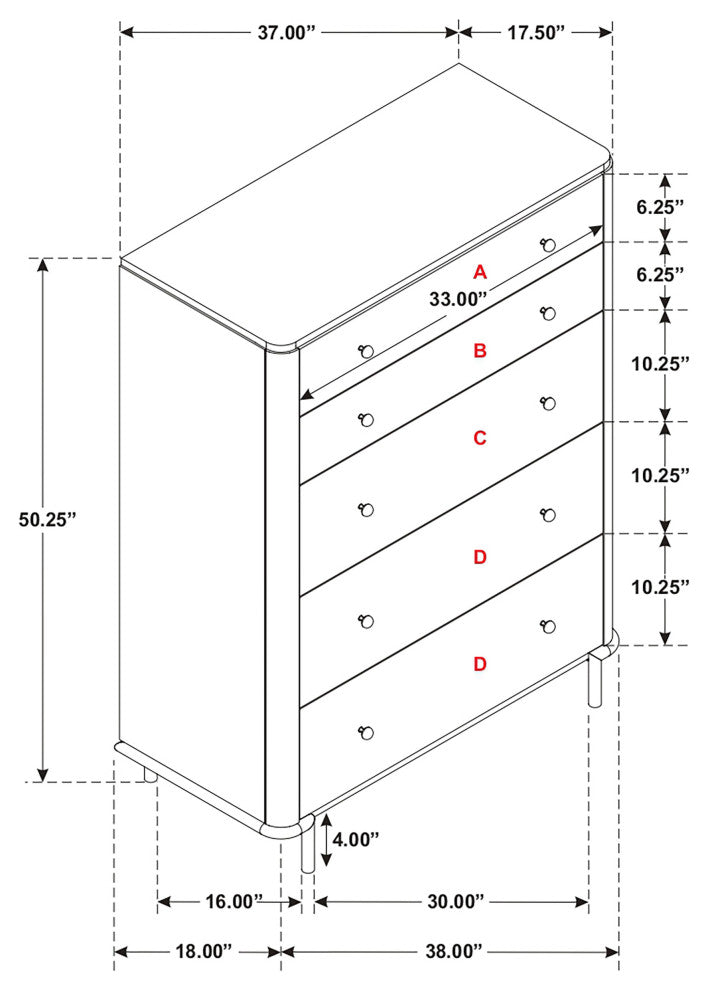 This charming mid-century, modern, five-drawer chest offers a gorgeous contemporary glam look with its softly rounded corners and aged brass metal hardware. A neutral sand wash wood tone with a wire-brushed finish adds texture and warmth to bedrooms. Clever details like a soft felt-lined top drawer for delicates offer a finishing touch to complete your sophisticated bedroom retreat.