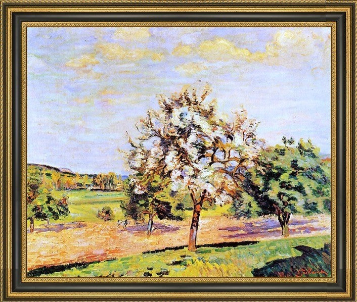 16" x 20" Armand Guillaumin Apple Trees in Bloom framed premium canvas print reproduced to meet museum quality standards. Our Museum quality canvas prints are produced using high-precision print technology for a more accurate reproduction printed on high quality canvas with fade-resistant, archival inks. Our progressive business model allows us to offer works of art to you at the best wholesale pricing, significantly less than art gallery prices, affordable to all. This artwork is hand stretched onto wooden stretcher bars, then mounted into our 3 3/4" wide gold finish frame with black panel by one of our expert framers. Our framed canvas print comes with hardware, ready to hang on your wall. We present a comprehensive collection of exceptional canvas art reproductions by Armand Guillaumin.