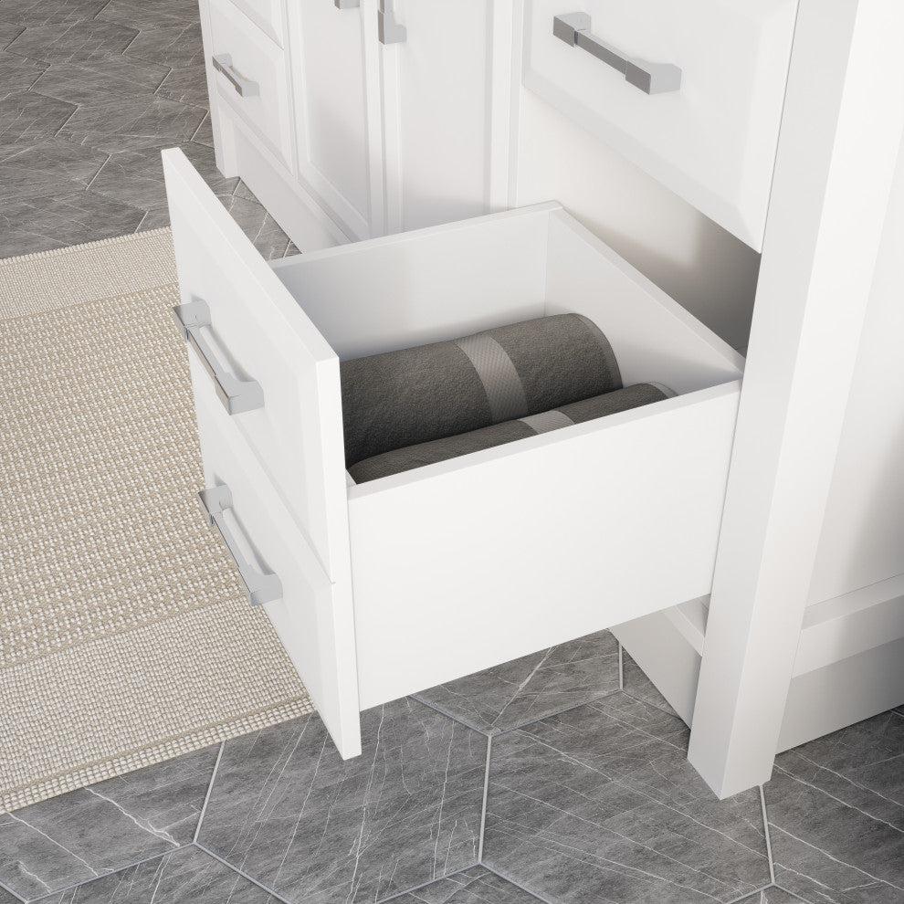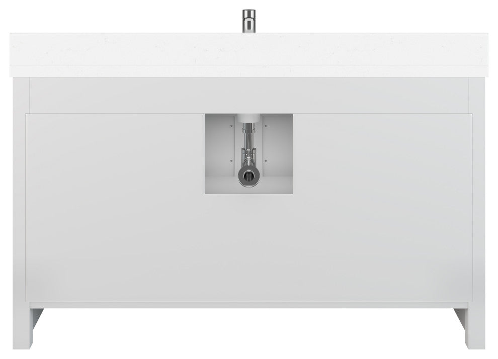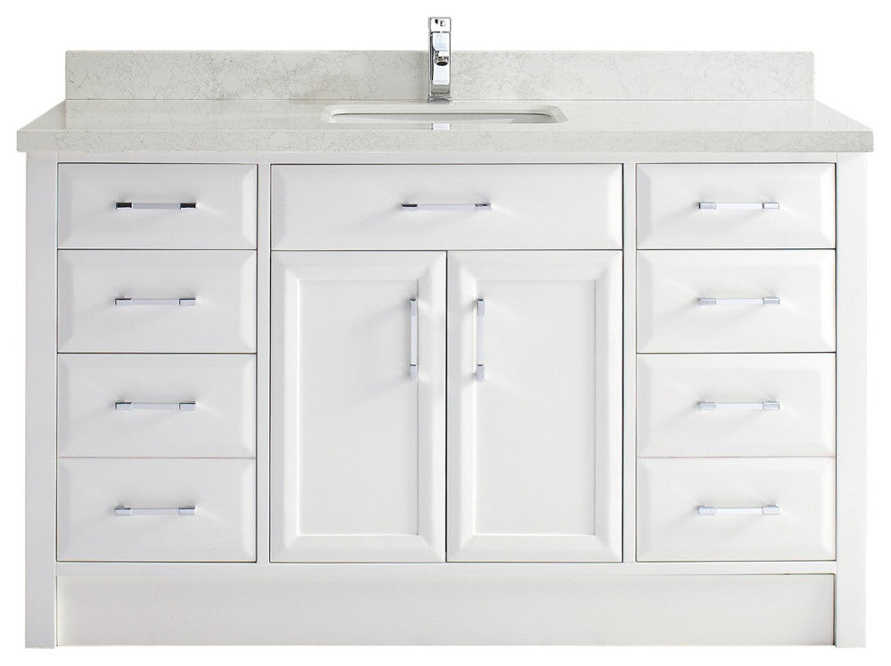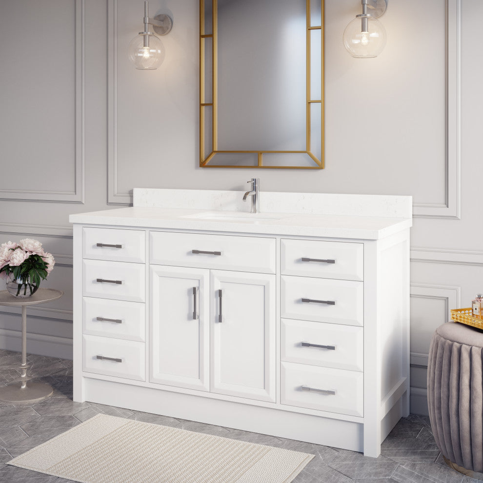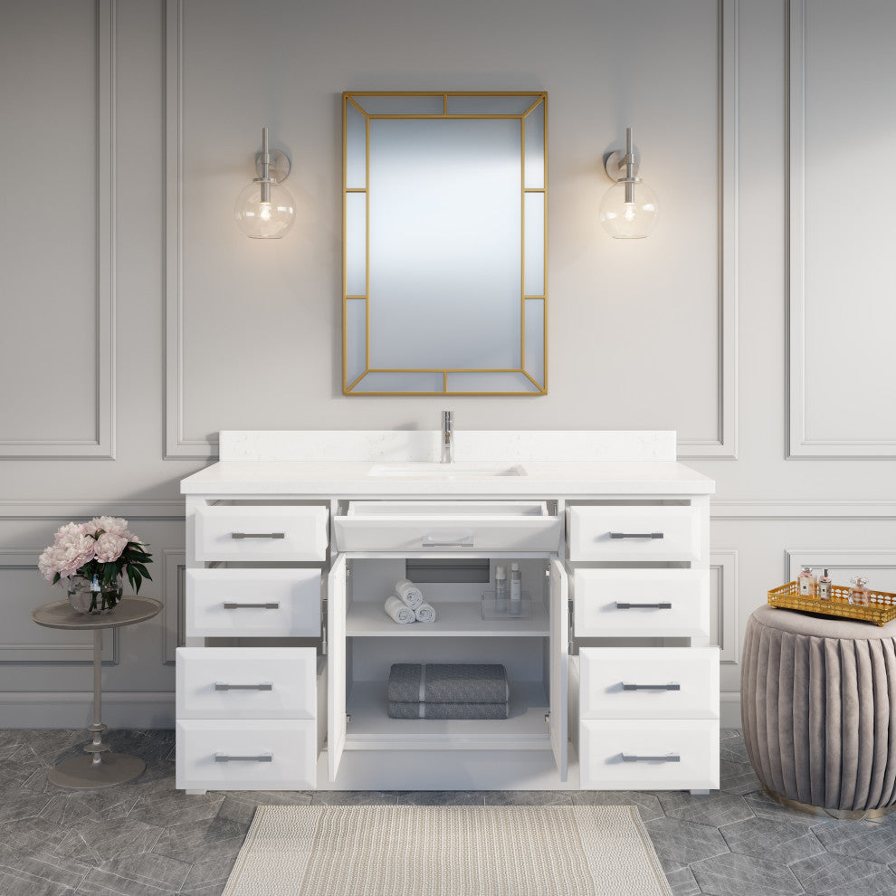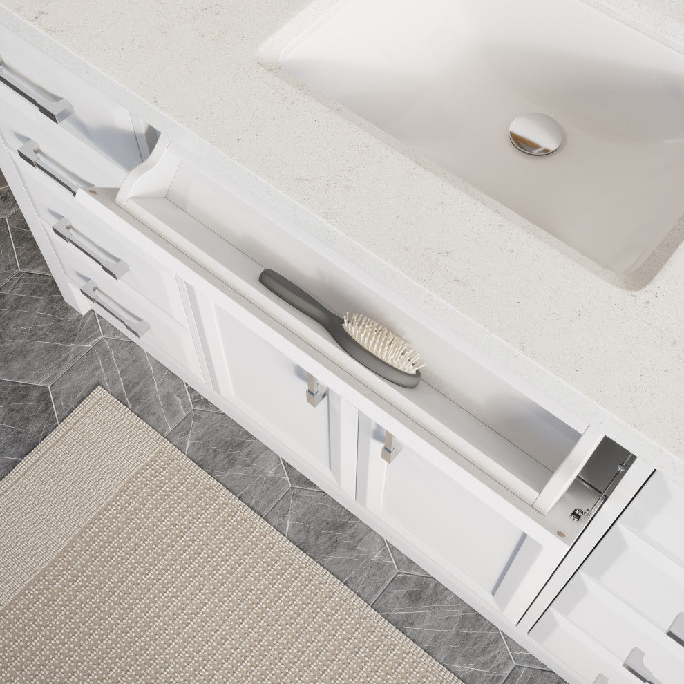 The vanity fuses contemporary sensibilities with polished, transitional design to create a timeless focal point for your bath space. The countertop is crafted with natural and engineered materials to minimize maintenance and fragility yet emphasizing aesthetics and practicality.PATENT PRODUCT DESIGN: #153683FEATURES•Solid birch hardwood frame with high quality plywood panel for a sturdy cabinet•Blum BluMotion® soft-closing drawer glides•Soft-closing cabinet doors•Foldable front and side kick plates create two unique looks--PATENT PRODUCT DESIGN: #153683•Tilt-out drawer•Adjustable shelf•Adjustable legs to eliminate wobble on uneven floor•Two toned hardware (Polished chrome and Brushed nickel handles)•Rectangular under mount ceramic sink (pre-installed)•Engineered stone countertop with matching backsplash•Vanity comes pre-assembled•Countertop drilled for single hole faucet (faucet not included)•CUPC certified sink•CARB2 compliant"