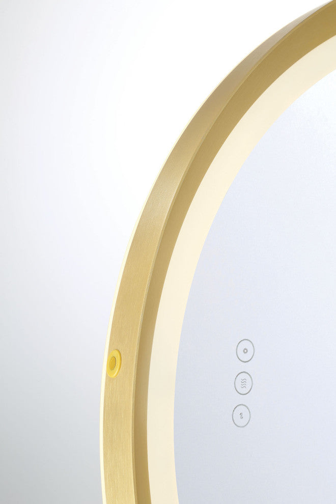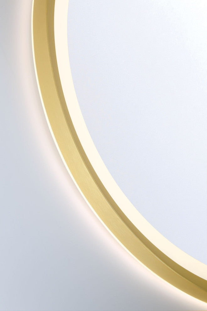 The Artell Mirror in Brushed Gold is a stylish and sophisticated 32" x 32" round LED mirror designed to elevate any space with its sleek, contemporary style. With integrated LED lighting, this mirror offers optimal lighting for any bathroom or hallway, providing a luxurious touch to your home decor. Featuring a brushed gold finish, this mirror combines function and aesthetic appeal, making it the perfect addition to a modern home. This product is cETLus certified.•Number of Lights: 1•Bulb Type: LED integrated•Wattage: 59W•LED Color Temperature (K): 3000/4500/6400K•Dimmable: Yes•Bulb Included: Yes•Voltage: 120V•Hardwire or Plug-in: Hardwired