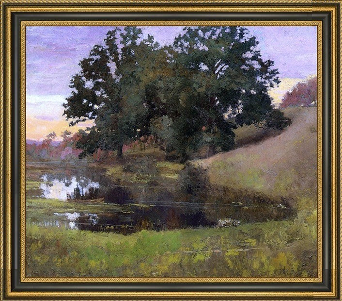 16" x 20" Arthur Wesley Dow Hillside Pool framed premium canvas print reproduced to meet museum quality standards. Our Museum quality canvas prints are produced using high-precision print technology for a more accurate reproduction printed on high quality canvas with fade-resistant, archival inks. Our progressive business model allows us to offer works of art to you at the best wholesale pricing, significantly less than art gallery prices, affordable to all. This artwork is hand stretched onto wooden stretcher bars, then mounted into our 3 3/4" wide gold finish frame with black panel by one of our expert framers. Our framed canvas print comes with hardware, ready to hang on your wall. We present a comprehensive collection of exceptional canvas art reproductions by Arthur Wesley Dow.