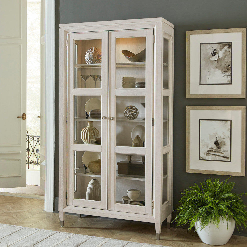 Elegant and welcoming, the Ashby Place 2-Door Display Cabinet enhances the aesthetic appeal of any space. This piece features a tall rectangular silhouette with glass side panels, providing maximum visibility of the items displayed inside. Behind two glass doors are four adjustable framed glass shelves and one removable framed glass shelf, offering customizable storage to accommodate items of different sizes. Two LED lights illuminate the displayed items and create a visually stunning effect, while a touch switch allows for easy operation. The clean-lined silhouette is adorned with shaped molding and nickel-finished metal accents, creating a timeless yet modern look that complements several interior styles.
