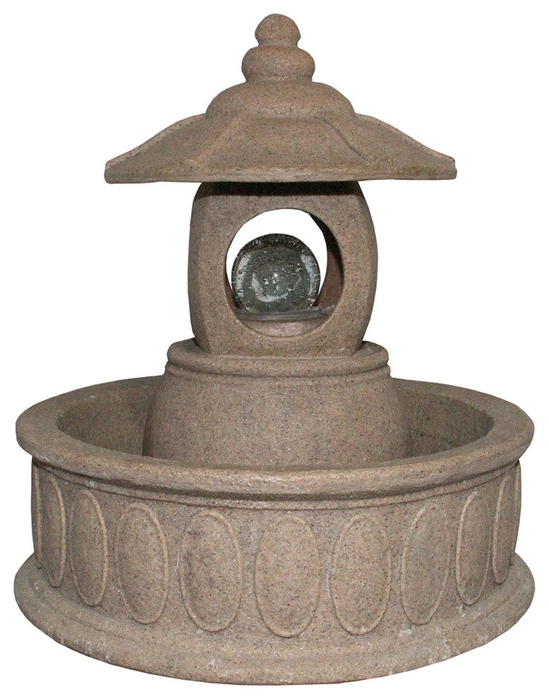 Relax to soothing falling water and visual beauty of designSelf-sustaining fountain features a pagoda style structure With a clear ball in the center which spills the water out from underneath it and into the decorative fountain basin belowBall is illuminated from the column below by white LED lightsFeatures a sandstone style finishConstantly recycles the same waterSome assembly requiredAdditional Product Features:Durable and weather resistantSubmersible low voltage Jebao water pump WP-450Pump input: 120 volts, 60 hertz, 0.082 amps, 9.84 wattsAC adapter input: 120 volts, 60 hertzAC adapter output: 12 volts200 milli-ampere2.4 volt-ampereClass 2 power supplyRainproofUL listed for indoor or outdoor useDimensions: 25.5" high x 22" diameterMaterial(s): resin/fiberglass/acrylic