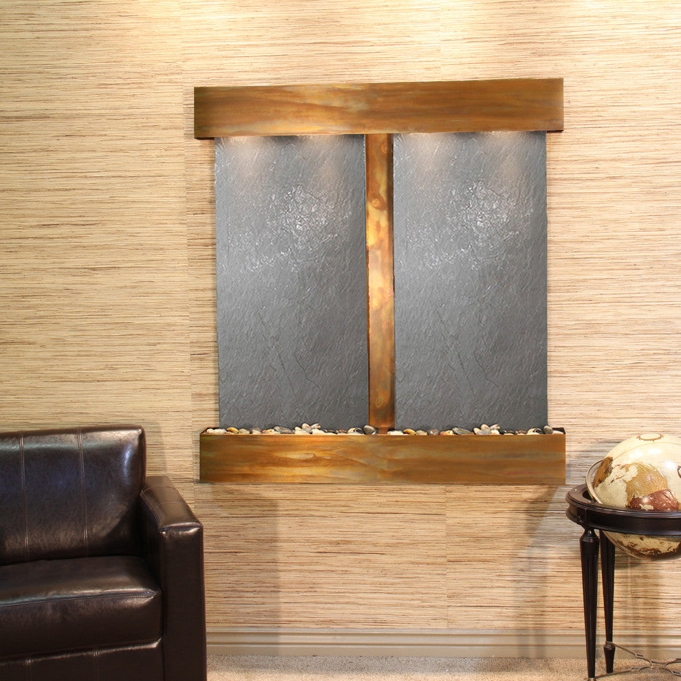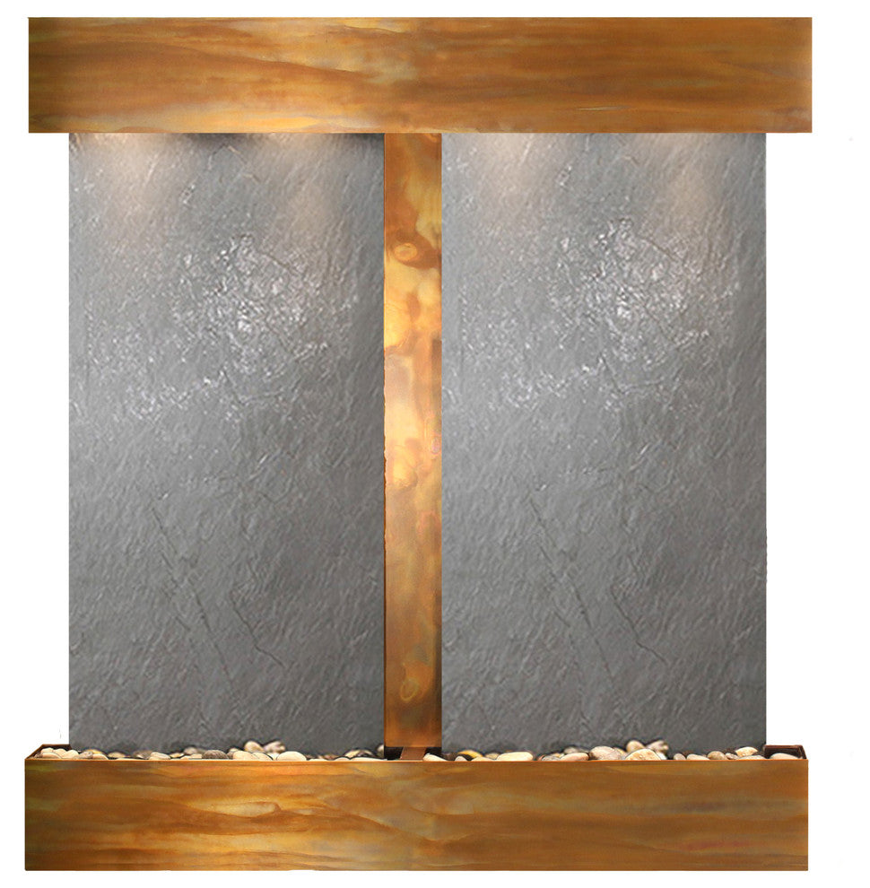 The Aspen Falls water fountain features two panels of natural slate, marble, mirror, or FeatherStone. The beauty of flowing water is doubled with the two water surfaces. Many metal trim options are also available to help you enjoy the sound of running water. An EZ install bracket is included, making hanging the water feature simple. The water feature only needs to be cleaned every 2-3 months if you are using distilled water.50" L x 54" H x 6" D, easy to hang, complete with colored instructions and hardware for hanging on a sheetrock wall. Hanging Weight 120 lbs.This unit includes: 4 halogen lights Polished river rocks Electric pump 3-way pull chain that allows you to run just lights, just water, or lights and water. Welded plastic liner insures against leaking and unique water distribution unit system will not clog. 110V, 100W; one cord operates entire unit; 90 degree plug can be concealed behind water feature. Durable powder coat finish; Manufactured and assembled in the USA with a 1 year limited warranty. • This light-weight slate veneer known as FeatherStone is natural stone and therefore may differ in color and texture from the photos shown.