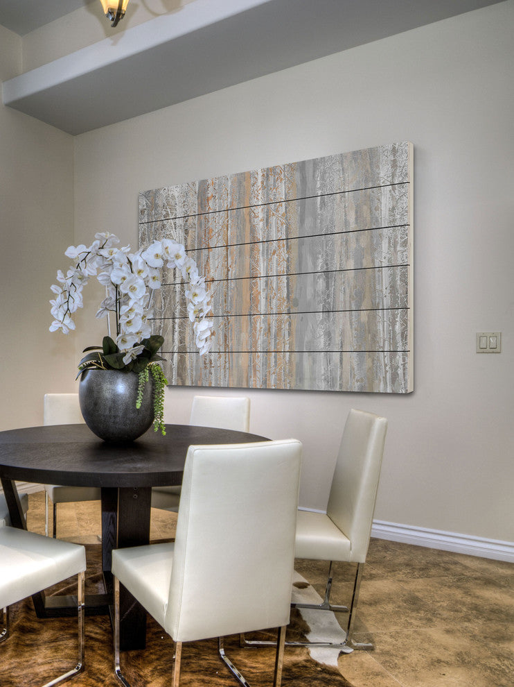 Striking and unique, the "Aspen Forest 1" UV Ink Print on White Wood60"x40" by Parvez Taj will bring your walls to life. Printed on white pine wood, this 60 inch wide by 40 inch tall contemporary artwork will make a statement in any living room, dining room, or bedroom.- Fine art UV ink print on white wood by Parvez Taj- wood pieces are hand-selected by Fine craftsmen for printing- Arrives ready to hang- Includes a certificate of authenticity- Artist signature on the front