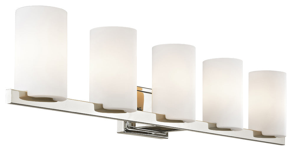 The minimalist Astoria collection draws the eye to the soft, warm glow of the light emitted from the cylindrical satin opal etched glass shades available in a brilliant polished chrome, a subdued brushed nickel or a soft olde bronze.Glass Type/Shade Type: Hand Blown Satin Opal White Cylinder GlassFinish: Polished ChromeMaterial: SteelNumber of Bulbs: 5Bulb Base Type: Medium BaseMax Wattage: 100Backplate Size: 7.25" W x 5" HExtension: 6.25"Suitable for Dry Locations? YesSuitable for Damp Locations? YesSuitable for Wet Locations? NoADA Compliant? No