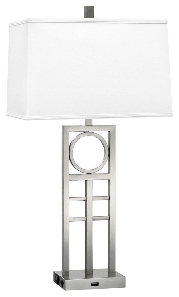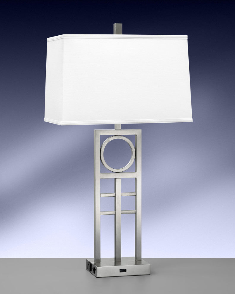Standard Lamp Specifications for #U2E222:Product Type: Desk LampHeight: 26"Finish: Brushed SteelConstruction: SteelSocket: (2) Ceramic On/Off Med. Base Type A 60W Max socket(s). (Bulb not included)Switching: (2) On/Off Rocker switch(es) located on the base.Cord: 8'' (from base) long black 16 gauge cord set with a 3 prong grounded plug.Electrical Outlet: (2) 3 prong grounded outlet(s).Data Port: None.USB Port: (1) 10W/2A USB port(s).UL/CUL and/or ETL listed: YesHarp Pipe Size: 6 inches (bead-to-bead)Standard Packing: 2 per carton (shade packed separately).Lamps & Shades per SKU: 2Lamping: (2) Ceramic On/Off Med. Base Type A 60W Max socket(s).Shade Size and Description: White fabric laminated to rectangular styrene hardback drum with self fold trim measuring 7"/15" x 9"/16" x 9.5" w/ .5" drop w/flatted washer (Top x Bottom x Slant).Bulb Included: NoMaterial Description: constructed from polished, plated, and lacquered steel.