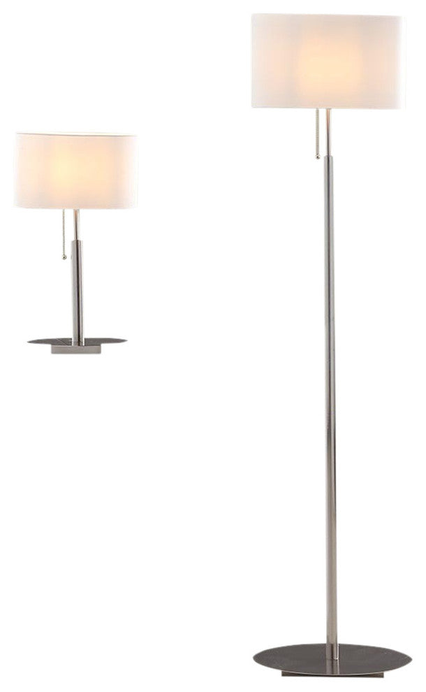 Bring touch of class to any room with the "Audrey" slim oval European design brushed steel lamp set from Artiva USA. This modern set is perfect addition to any home, office or smaller room where space is an issue. The stylish slims design is a sure to compliment a variety of decors.Set includes 1 table lamp and 1 floor lampModern slims oval European designSolid 1 pieces oval frame constructionBulb Type: IncandescentSwitch Type: Pull-chainShade Material: FabricBulbs Included: No