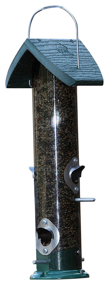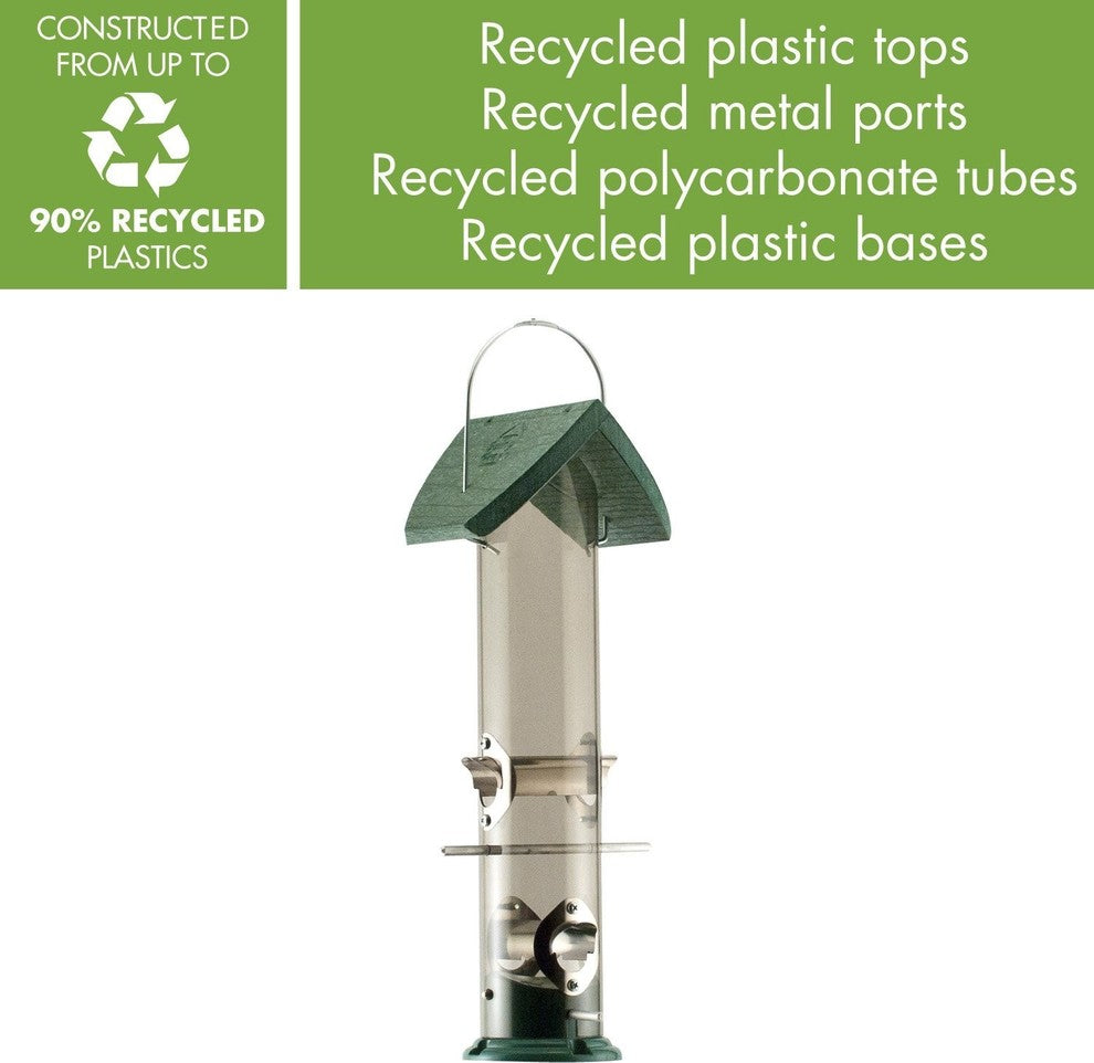 Constructed from up to 90% recycled plastic this bird feeder is environmentally friendly and designed for attracting birds. Capacity up to 2 lbs. Easy to fill and clean with the new EZ clean push button. Quick release base, ready to hang.• Size: 18"• 2 lbs capacity• Constructed from up to 90% recycled plastic• Environmentally friendly & designed for attracting birds• Ready to hang• Easy to fill & clean with the new EZ clean push button• Quick release base.