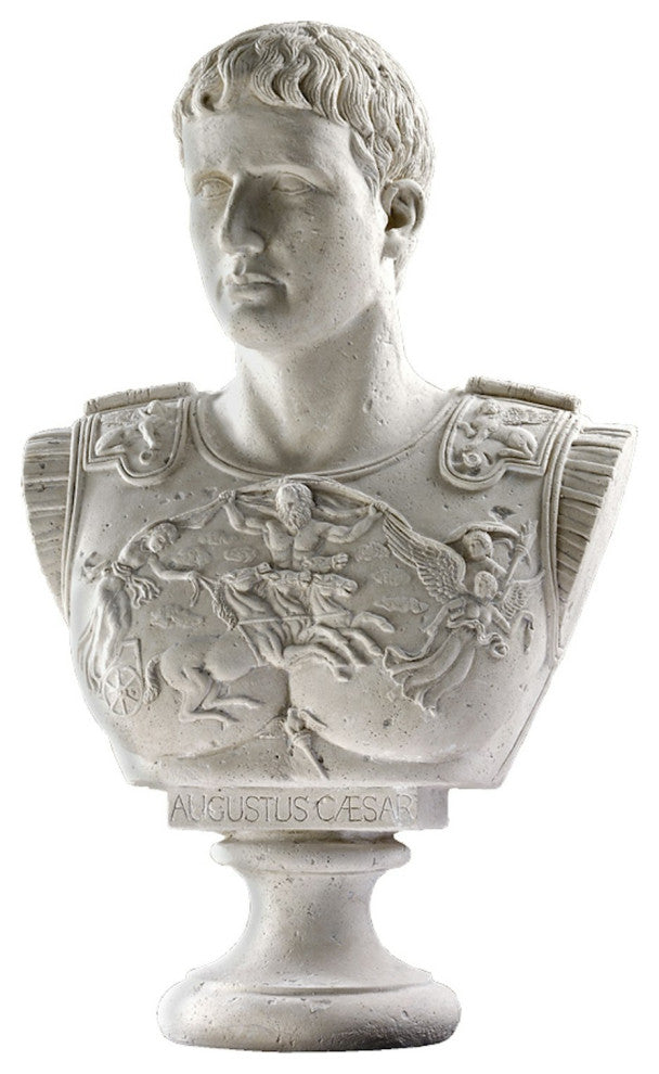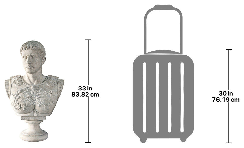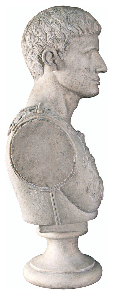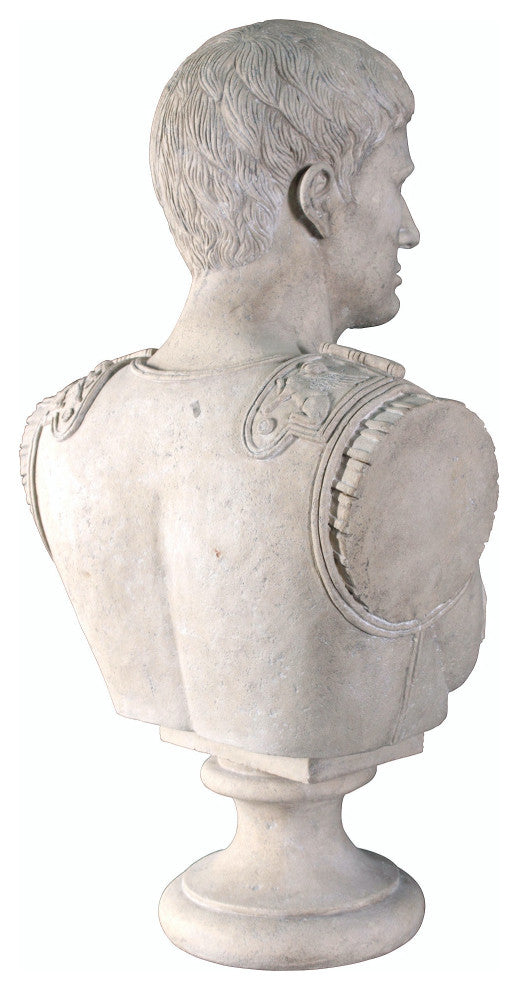 Our grand-scale bust is sculpted in painstaking detail from the museum original, which was discovered on April 20, 1863 in the villa of Liva at Prima Porta, near Rome. As the commander-in-chief of the Roman army, Caesar Augustus is shown proclaiming triumph to his troops. From his distinctively handsome features to the detailed, bas-relief breastplate armor, this gallery statue has fascinated generations. An investment in classic European sculpture, our impressive life-sized sculptural bust is cast in quality designer resin with a faux stone finish as a sophisticated statement piece for your garden or home. 20"Wx10"Dx33"H. 24 lbs.