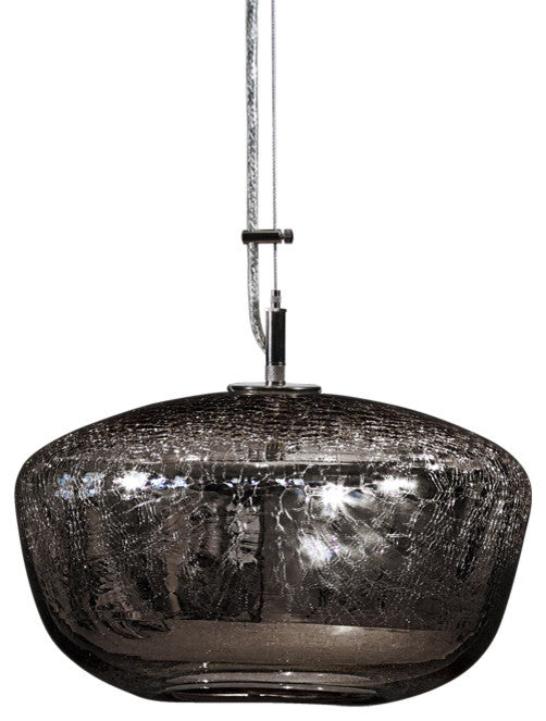Hand-blown crackled mirrored glass pendant by designer Joe Ginsberg. Each pendant in this collection is unique and will vary slightly due to the handmade process of glass blowing. The lighting fixture includes nickel plated hardware with a 5 inch canopy; 6 ft. braided steel electrical cord and an Edison-style Filament bulb. 60w; 120v. Made in the USA.
