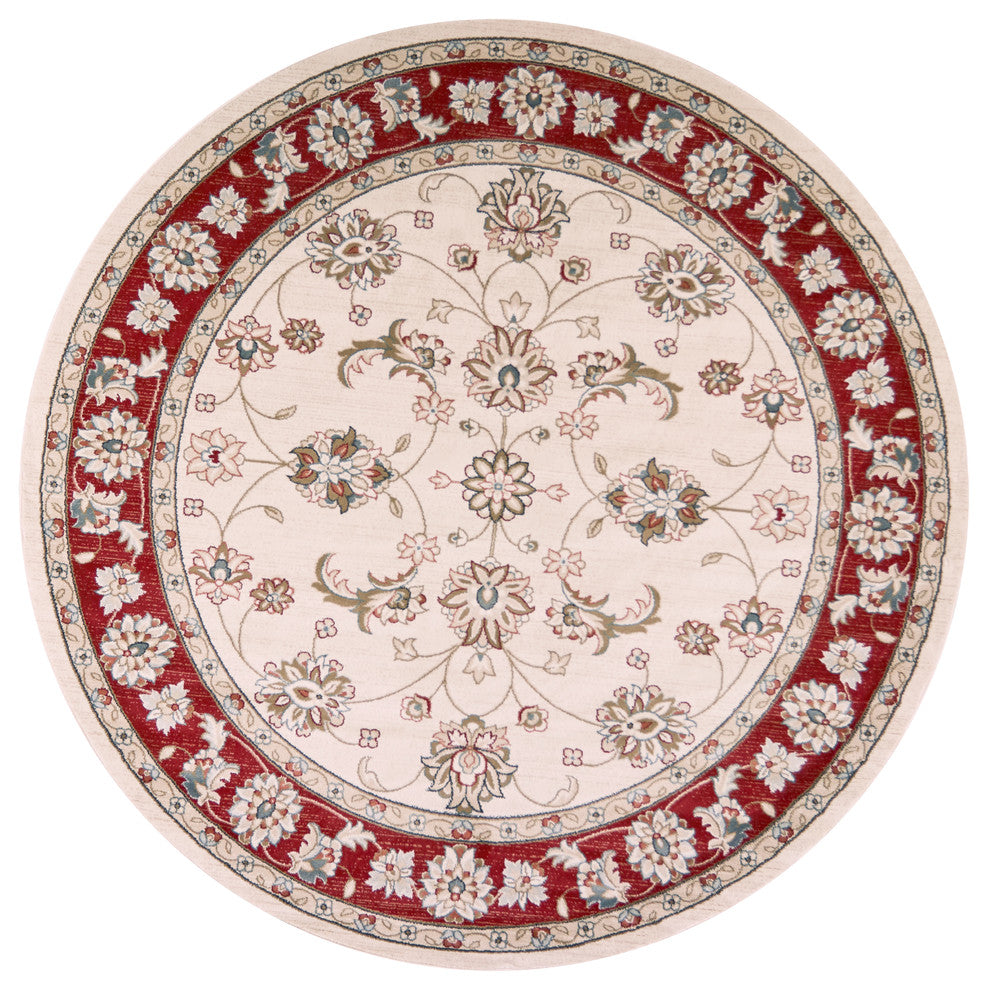 Avalon 5613 Ivory/Red Mahal 7''10" Round. Machine-Made of 100% Polypropylene with No Backing. Made in Turkey. Vacuum regularly & spot clean stains. Professional cleaning recommended periodically.