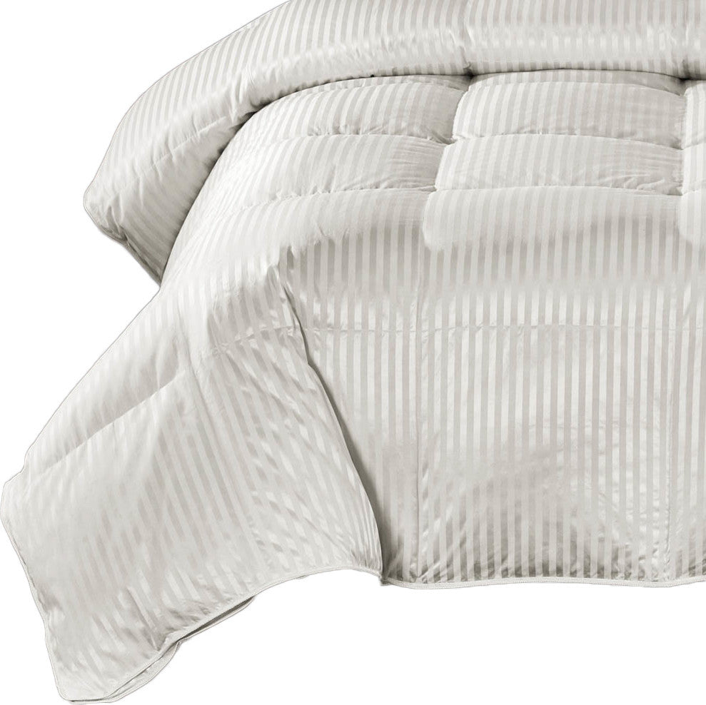 Our exclusive light cream striped silk and cotton comforter cover is the heaviest down proof fabric and it is tightly woven with highest 2-ply 450 thread count to prevent down from escaping your comforter. This gorgeous piece of bedding features a 51% silk and 49% cotton down proof cover with an industry-leading thread count. Sleeping under the heaviest down comforter is like nothing you''ve ever known. This unique down comforter also features baffle box stitch through design that amazingly prevents shifting of down in the duvet keeping it evenly distributed for greater warmth. • Comforter Shell Material: Down-proof 51-Percent Silk, 49-Percent Cotton• Thread Count: 2 Ply 450 Thread Count per Square inch• Striped White Down• Fill Power: 550• Fill Weight: Depending on Size See Measurements• High-Extra Warmth, hypoallergenic• Workmanship: Double stitched with 1 inch Gusset & 4 corner ties• Royal Hotel Brand• Dry-Clean onlyAvailable Sizes Include:• Full/Queen: 1 Queen Comforter 90 wide x 90" long with 48 ounces off white down fill.• King/Cal-King: 1 King/Cal-King Comforter 106 wide x 90" long with 56 ounces off white down fill.