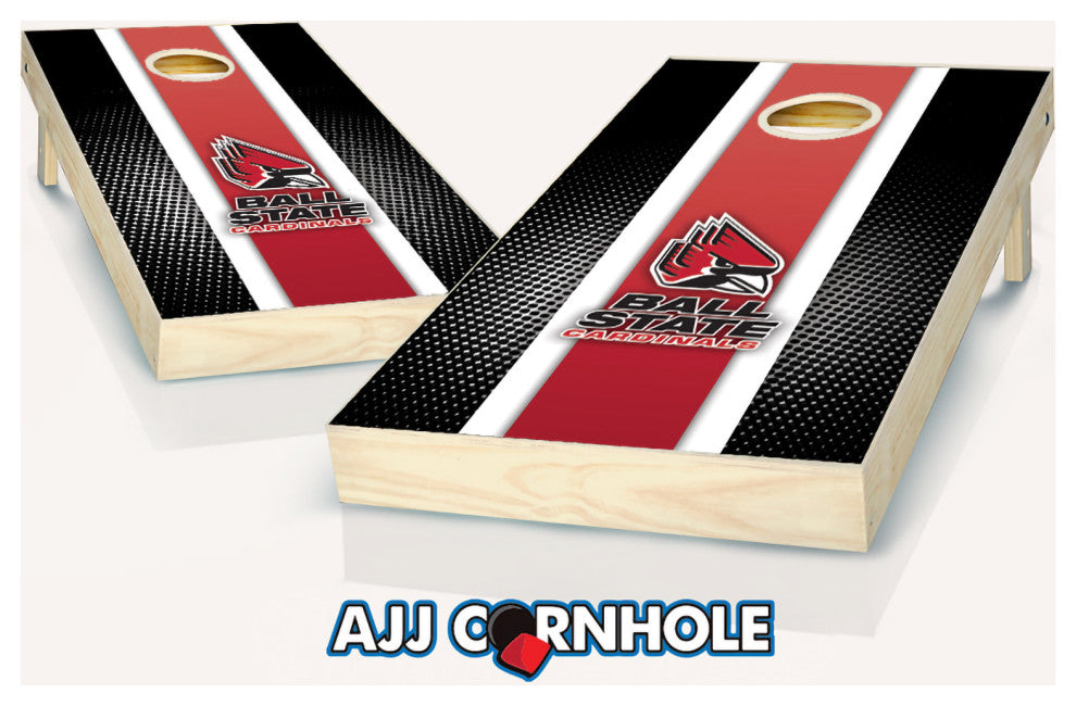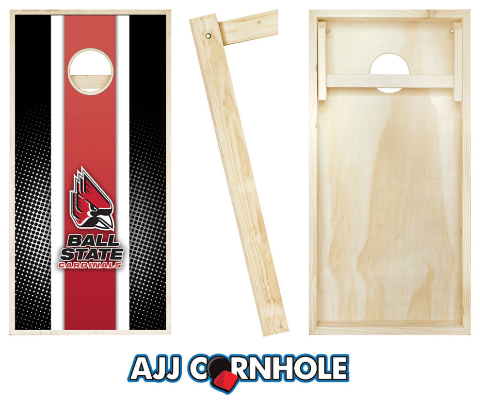 Officially Licensed Ball State Cornhole Set. Show off your pride at your next cookout or tailgate with our signature striped design. Cornhole Set comes ready to play right out of the box, no assembly required! Set comes complete with 2 wooden game boards and 8 licensed Ball State bags! Officially Licensed Collegiate ProductRegulation Size (2 Feet x 4 Feet)Tournament Grade ConstructionFolding Legs For Easy StorageAll Wood Construction Set Includes 8 Bags. All sets are made using a premium 2x4 frame and 1/2" sanded plywood playing surface. Each set has folding 2x4 legs secured with galvanized bolts.