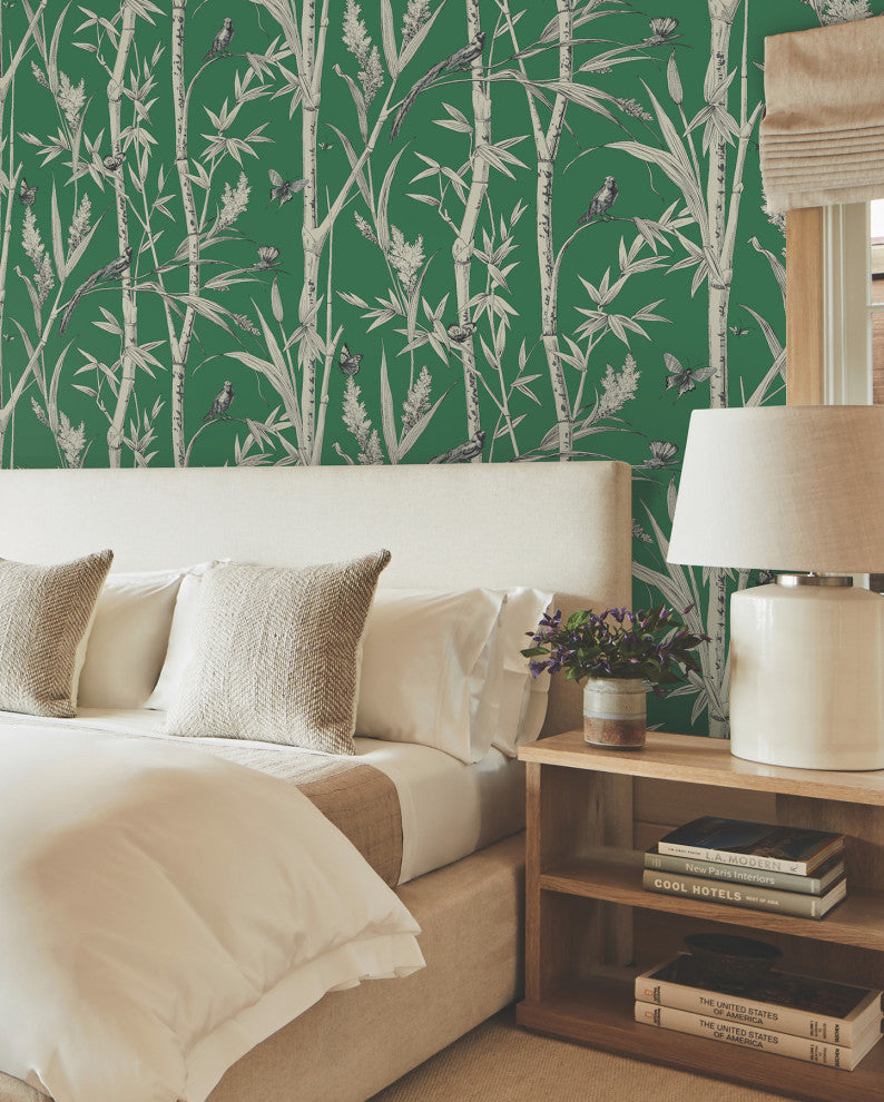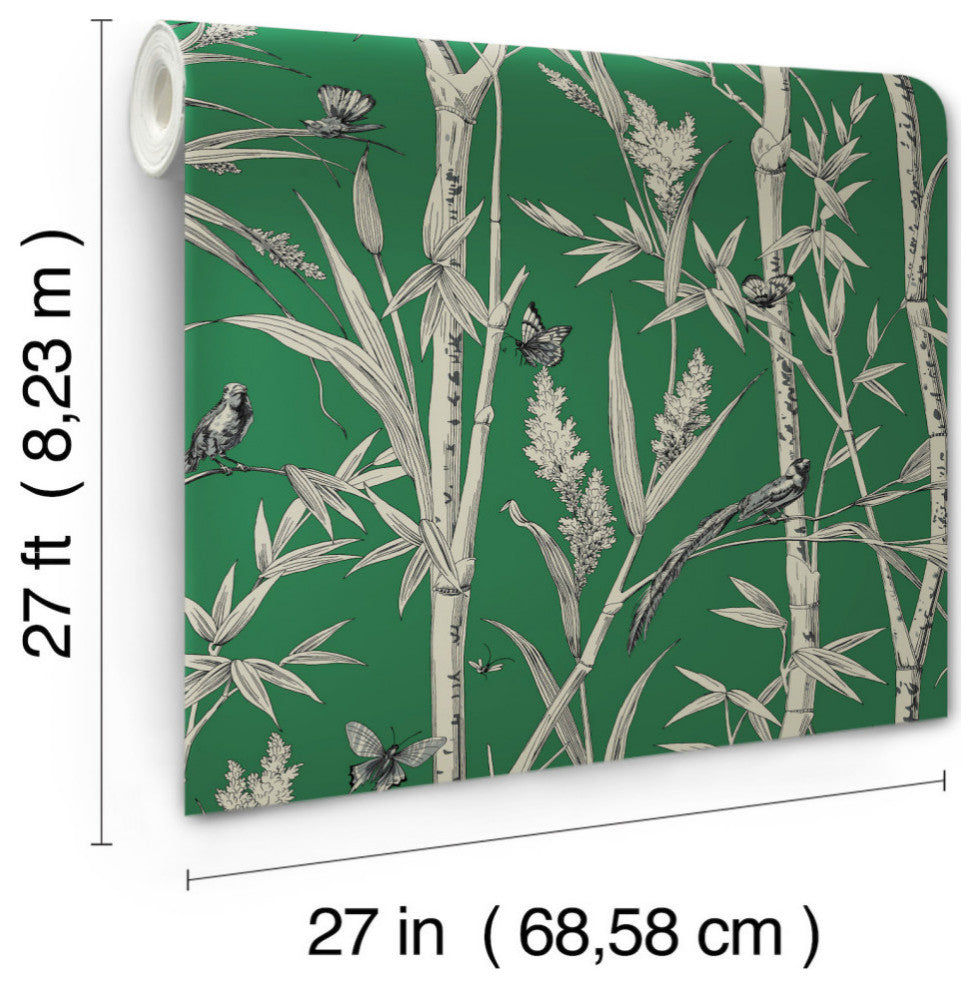 Bambou Toile perfectly captures the serenity of a bamboo forest, the illustrated flora and teeming wildlife inked in black and beige against rich green. This Bambou Toile Wallpaper measures approximately 27 inches wide by 27 feet long, measuring approximately 60.8 square feet per roll. The quintessential design for timeless romance, toile traces its origins to 18th century fabrics. This celebrated motif is explored with a range of classical reproductions and modern reimaginings. Unpasted non woven material; 25.25-in repeat, drop match; Washable and strippable; 27-in by 27-ft long roll; Covers about 60.8 square feet