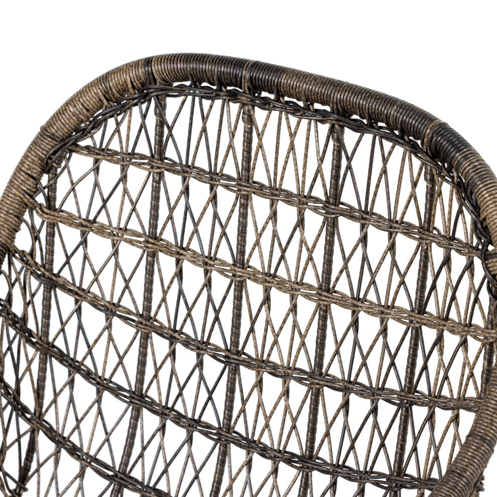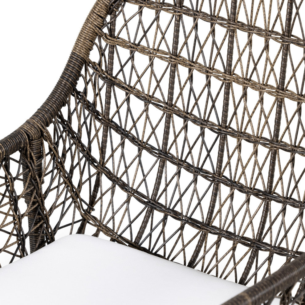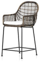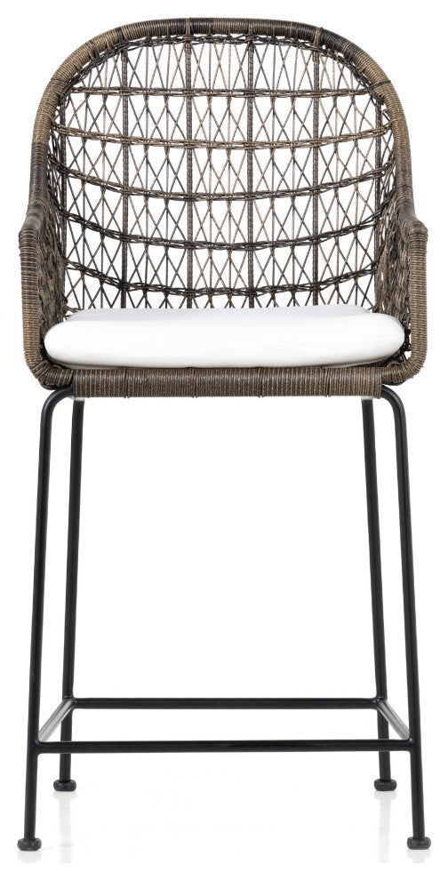 Clean, contemporary shaping and an updated weave transform all-weather wicker into something modern. This high-texture bar stool is supported by a contrasting black iron base, with a white seat cushion for comfort. Cover or store indoors during inclement weather and when not in use.