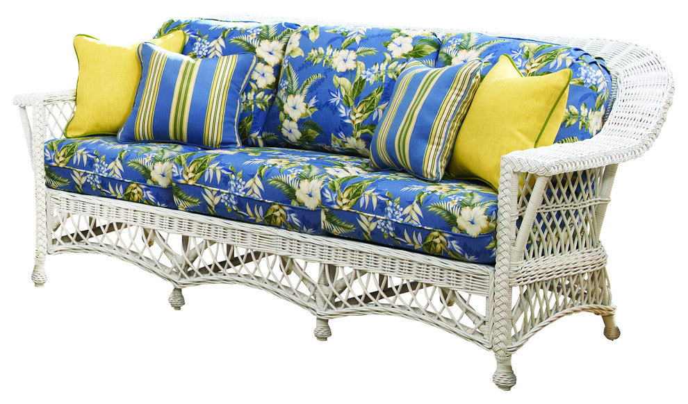 The Bar Harbor collection reflects the tradition of Maine summer vacations and long, lazy beach days. An understated elegant addition to your sunroom. Bar Harbor Sofa In White With Cusions. Please refer to fourth image for fabric swatch. Toss pillow not included.