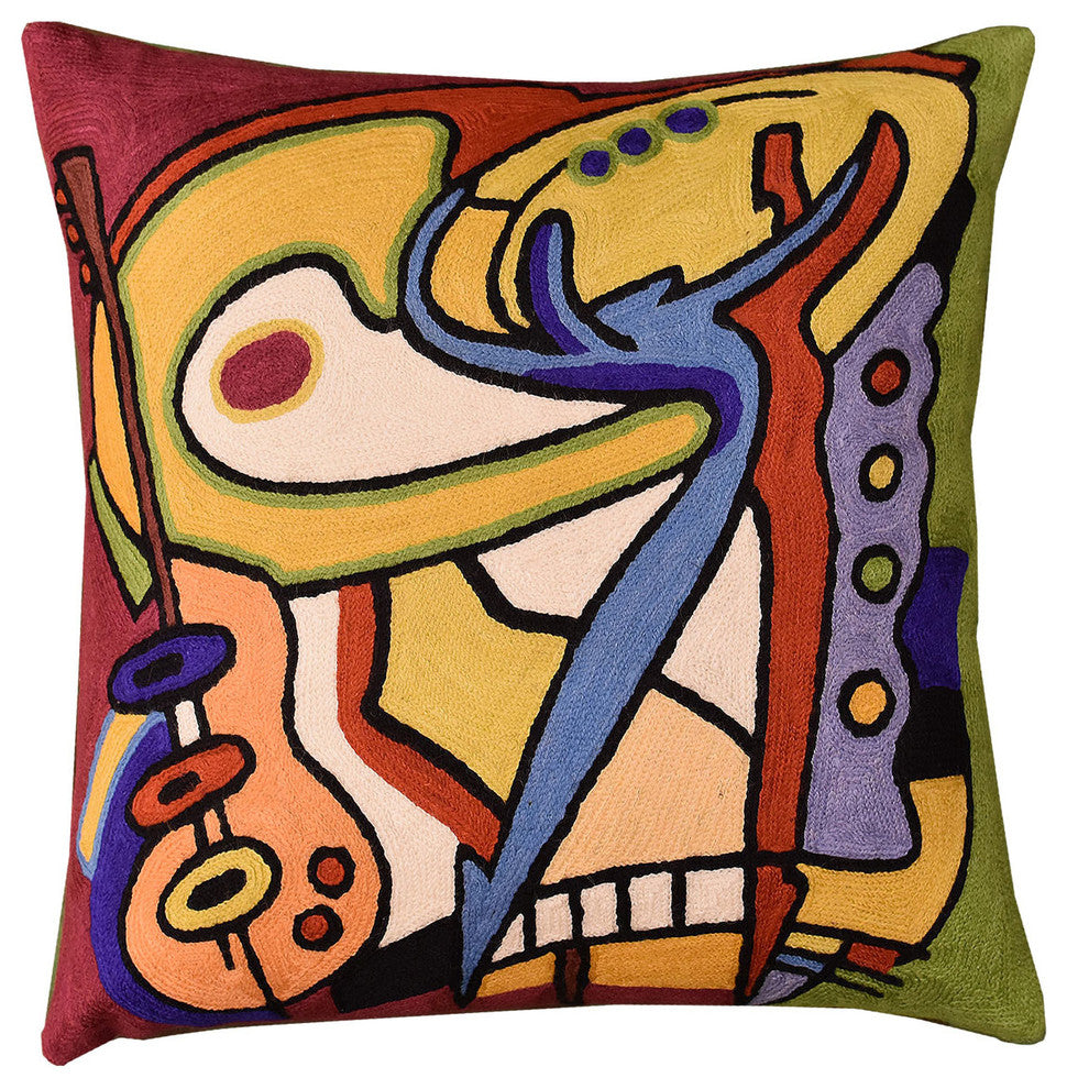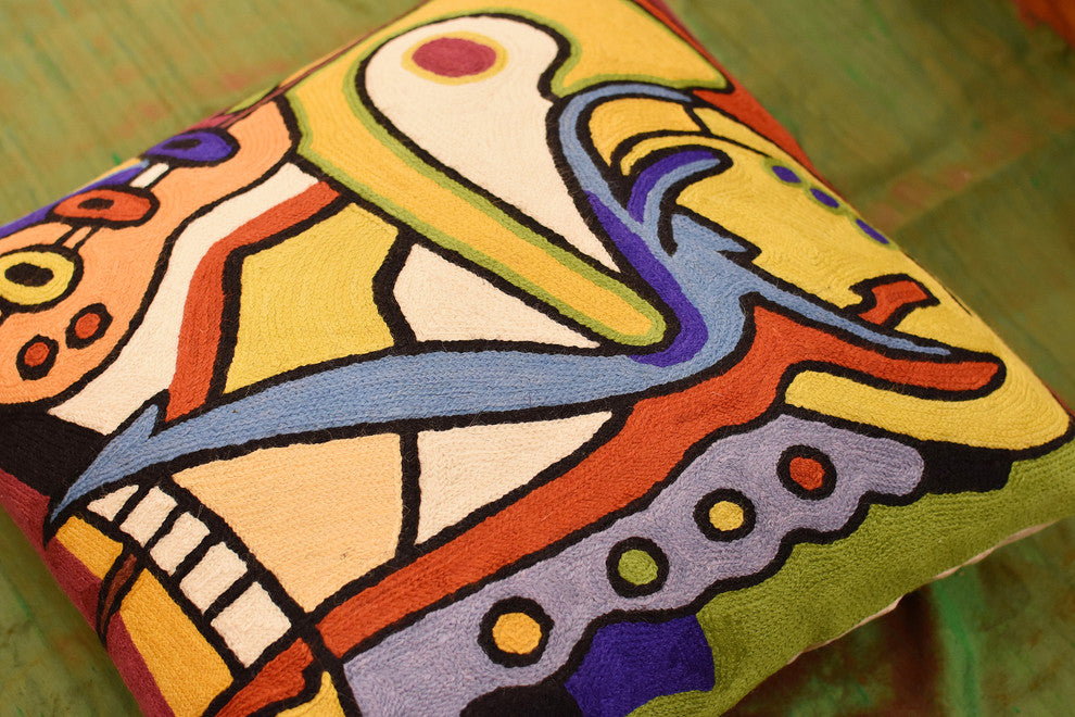 Kashmir is proud to bring together the modern abstract artwork pillow collection, inspired by world renowned artist Alfred Gockel and hand embroidered by the finest artisans of Kashmir, into the living spaces of patrons and connoisseurs"™ all around the world. These unique and modern pillows would bring the brighter elements of any room, creating a harmonious design and perfect air of sophistication This decorative Cushion Cover Fun in the Sun II throw pillow cover has beautiful colors and design hand embroidered in lively and refreshing colors. Swirls of colorful chain stitch embroidery hand embroidered from soft Kashmir wool adds a dazzling sheen to the creation. The eye-popping color and pattern of this creation is just what the designer ordered to create a fiery focal point in your décor. This all-natural accent pillow cover makes an enduring impression. Composition: 70% Soft Wool, 30% CottonSize: 18"³ x 18"³ (45cm x 45cm)Backing: Canvas ( See Last Picture )Pillow Insert not Included (Only Cover is on Sale)Hand embroidered in Village Cottage UnitsA close-up view of this abstract pillow cover allows you to see the amazing chain-stitch embroidery work of master artisans who have practiced this art their entire lives.Chain stitch embroidery on a cotton base produces a soft, fine crewel, and the stitches create definite swirls as distinct as your fingerprint. Kashmiri craftsmen produce the finest quality chain stitch needlework in the world. This abstract decorative pillow cover could grace the cabin of your boat or the chair in your solarium and yet be equally as comfortable in your den. Durable and easy to clean, this toss pillow will catch the eye of every passerby. The eye-popping color and pattern of this modern throw pillow is just what the designer ordered to create a fiery focal point in your décor. Perfect wherever you need a splash of color, this art work pillow creation is as durable as it is beautiful. Easy to care for, this cushion cover could spark up an old throw pillow or grace a new pillow form. World-renowned artist Alfred Gockel was born in 1952 near Münster, Germany. His artwork has been showcased in leading exhibitions all over the world. He draws his inspiration from: Picasso, Mirò, Chagall, Dali and Durer. He is a great admirer of Kandinsky. This is reflected in his high quality and artistic etchings.His particular focus is the art in public spaces.Alfred feels attachment to an art form, which includes design that leads to beauty and harmony. His vivid style is a sign of spontaneous creativity and artistic energy. The bright colors and the graceful motion of his characters mark his beautiful and artistic compositions, which reflect zest of life and push his works to a higher level of visual pleasure. He loves playing with form and color in a virtual way and describes his creative work as "œrhythmical painting"� His artwork seems to explode of vitality. The tremendous drive of his painting puts his characteristic figures and compositions in vibrations, which reflect consequently the motion in his artwork. Dance and music are his favorite themes. His originals begin as brief sketches to grip creative moments, which inspire him later and retain the charm of his drafts while he finishes his paintings.