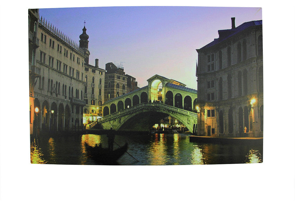 A beautiful depiction of Venice City at nighttime with a gondola riding down the streetThe bridge and building street lights are illuminated from behind the canvas by 4 LED lightsComes ready-to-hang with hooks on the backConvenient on/off switch on the sideRequires (2) "AA" size batteries - not includedFor indoor use onlyDimensions: 15.75"H x 23.5"W x .75"DMaterial(s): Canvas/wood/MDF (medium-density fiberboard)