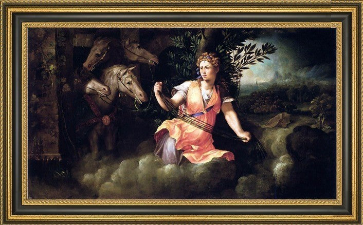 14" x 28" Battista Dossi Allegory of Dawn framed premium canvas print reproduced to meet museum quality standards. Our Museum quality canvas prints are produced using high-precision print technology for a more accurate reproduction printed on high quality canvas with fade-resistant, archival inks. Our progressive business model allows us to offer works of art to you at the best wholesale pricing, significantly less than art gallery prices, affordable to all. This artwork is hand stretched onto wooden stretcher bars, then mounted into our 3 3/4" wide gold finish frame with black panel by one of our expert framers. Our framed canvas print comes with hardware, ready to hang on your wall. We present a comprehensive collection of exceptional canvas art reproductions by Battista Dossi.