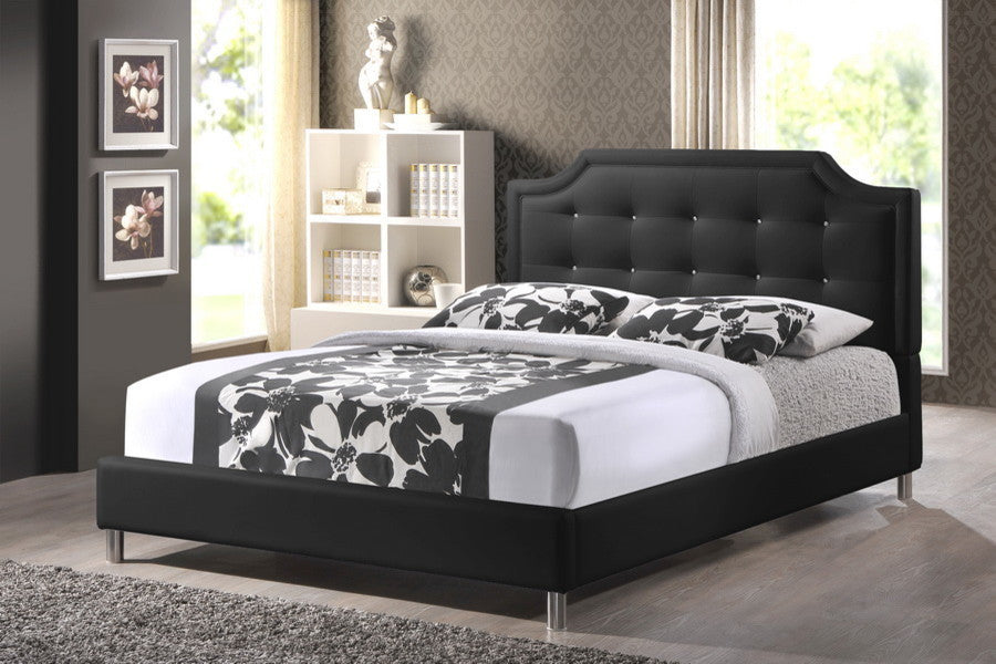 Clean, crisp, and contemporary is the Carlotta Designer Bed frame. Soft black faux leather outfits a scallop-cornered headboard with matching upholstered side rails and low footboard, making this a sleek style for sleeping. Malaysian-made, the queen sized Carlotta Contemporary Bed features an inner frame of hardwood and plywood, which are padded with foam before being upholstered. Faux crystals stud the headboard, creating a trendy button tufted look. This is a platform bed: wooden slats (included) serve as a box spring so only a mattress and bed linens are needed (mattress and linens are not included). Tying everything together are silver metal legs with non-marking feet. Easily maintain the Carlotta Bed by wiping clean with a damp cloth as needed. This style requires assembly and is offered in black (full, queen, and king size) or white (full, queen, and king size); each sold separately.