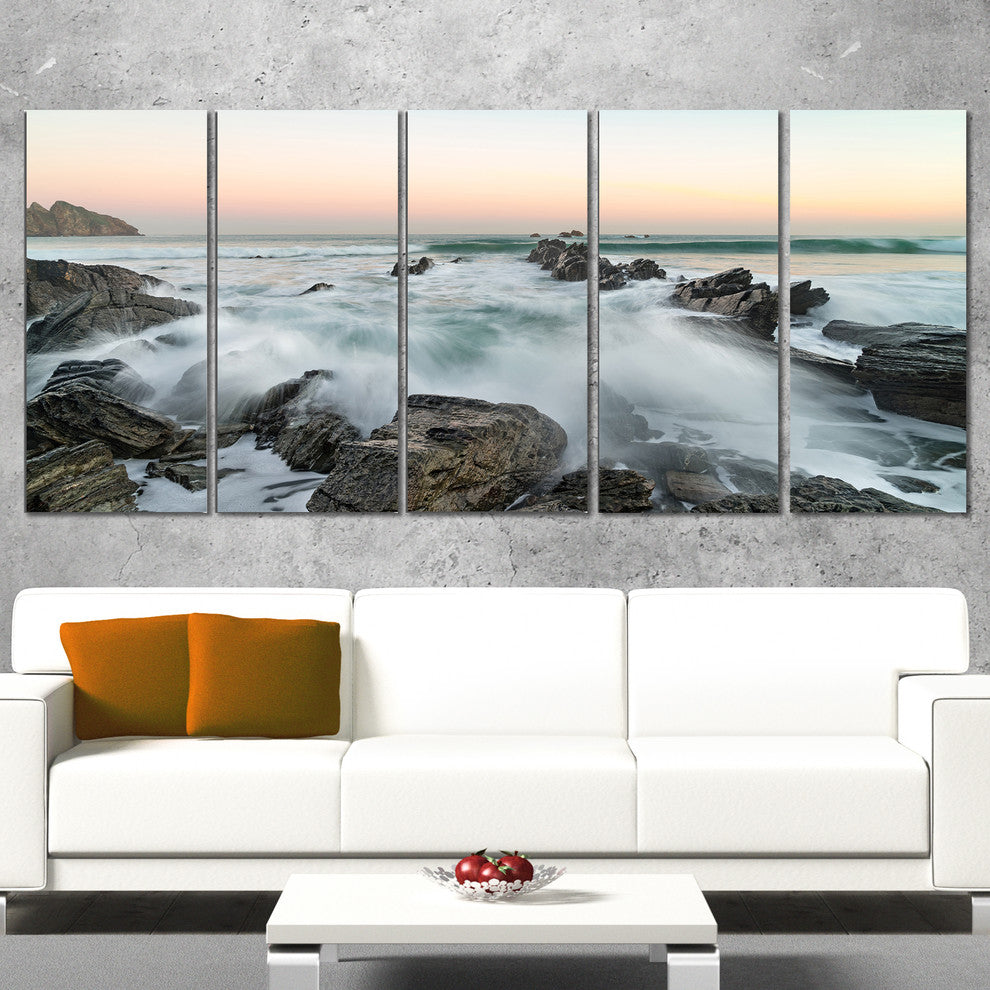 "Bay of Beaky Vibrant White Waves" Modern Seashore Canvas Art, 5 Panels, 60"x28"