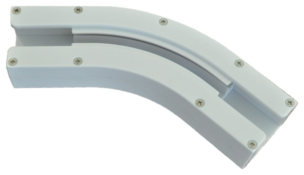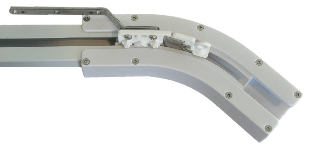 The 135 degree curved track is made for METechs drapery track system CL200BT. CL200BT with the curved track continually opens/closes curtain through 135 degree corner windows. Radius of curve is 5" (12cm). Ideal for Bay Windows.