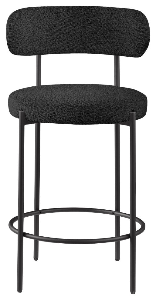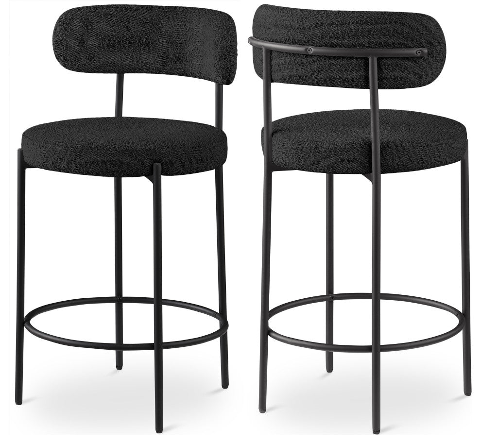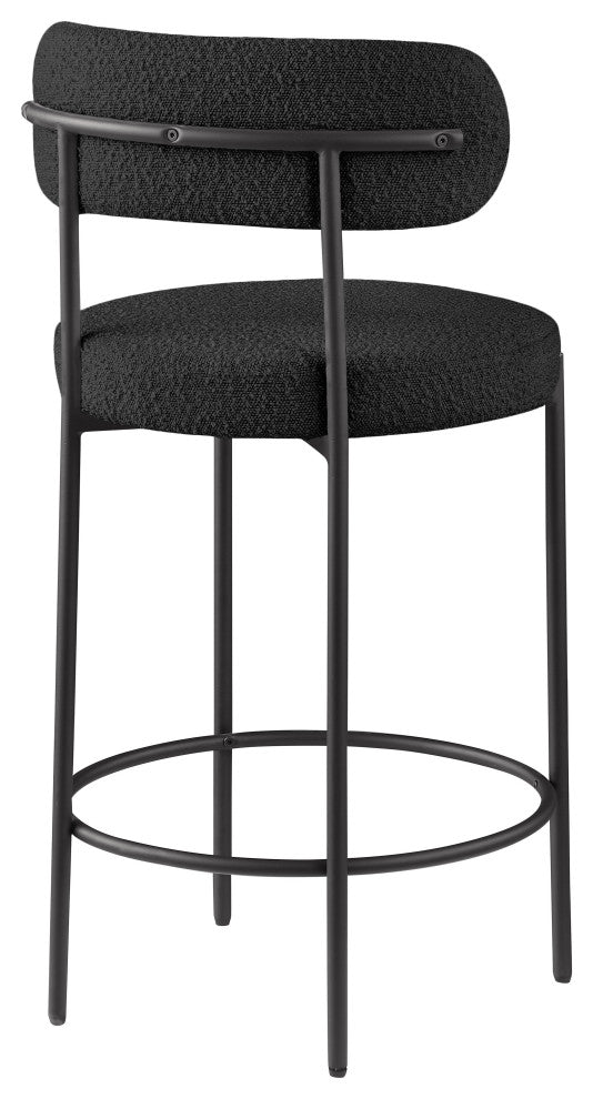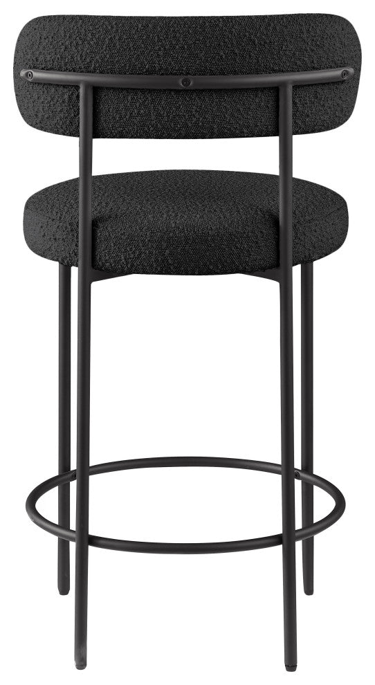 Make family, friends, and guests want to stay ''till closing time when they''re seated on these Beacon boucle fabric bar stools/counter stools. These handsome stools are just the thing your kitchen counter or home bar is missing, with their ultra-modern design and beautiful look. The curved backs support the body while you sip a frosty cold one or nosh on some breakfast fare. A matte black metal frame gives the stools'' design durability while the black boucle fabric adds a touch of softness and comfort.Overall Product Dimensions: 19.5" W x 19.5" D x 38" HRich Black Boucle FabricMatte Black Metal FrameIron Metal FrameCounter Height StoolContemporary DesignSeat Dimensions: Seat Width: 19.5"Seat Height: 26.5"Seat Depth: 17"Back Height: 11.5"