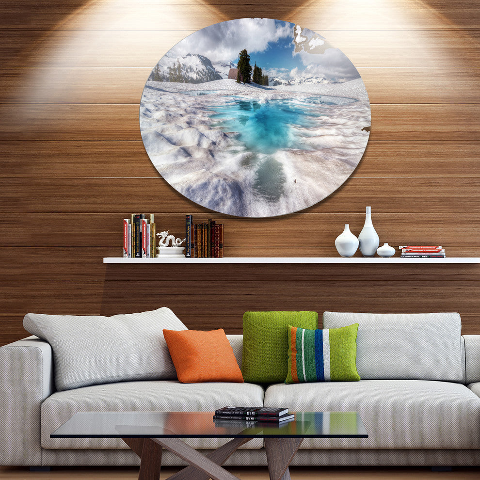 Bring Contemporary Abstraction to your home with this large Circle Metal wall art. This Beautiful Snow Covered Lake Metal Artwork makes it the focal point of any room or office.