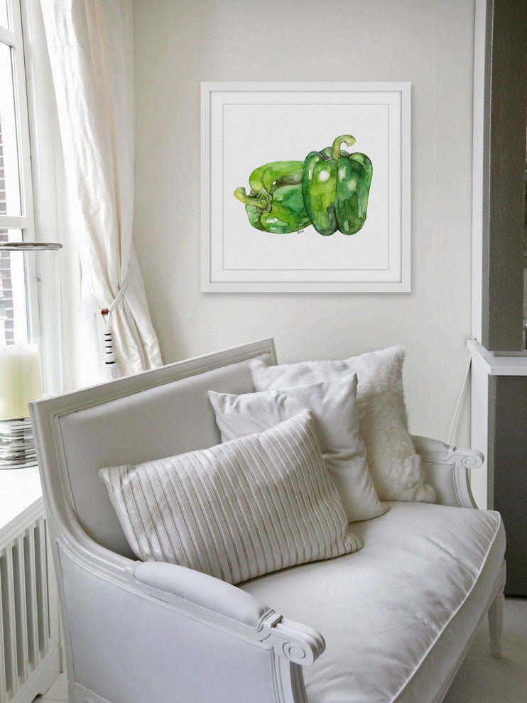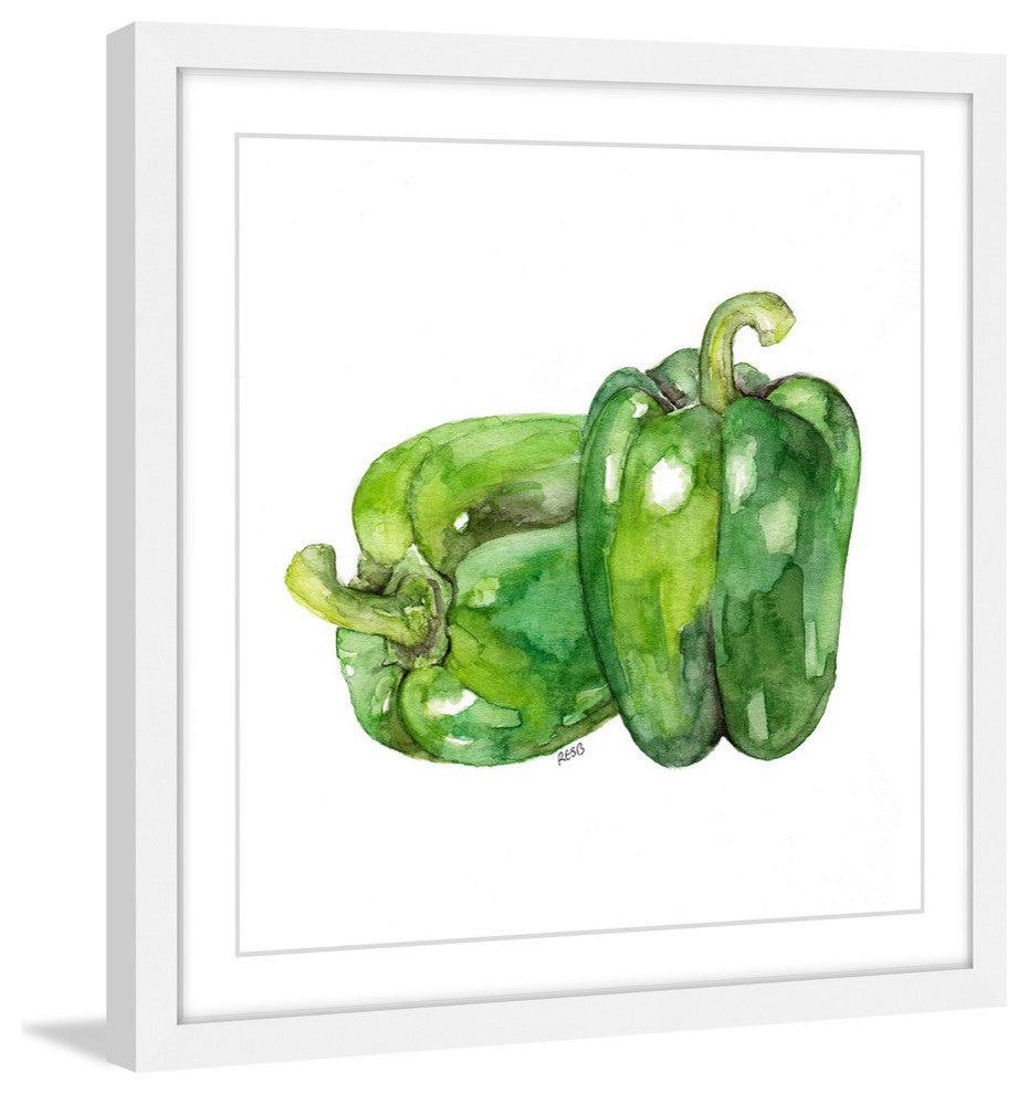 "Bell Peppers" Framed Print by Rachel Byler features vivid tones and supple artistry. Mounted in a gorgeous frame, this 18 inch wide by 18 inch tall piece will be an exceptional addition to any room. Top quality Giclee print on high resolution Archive Paper Artwork by Rachel Byler Professionally framed and mounted on acid free archive matte High quality durable non-warping frame Arrives ready to hang Includes a certificate of authenticity Made in the USA Artist signature on the front