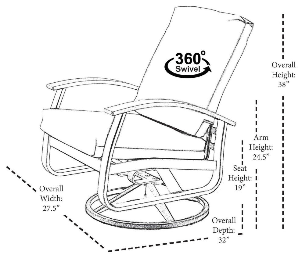 Style meets comfort in the Belle Isle Cushion collection. Thoughtfully crafted with a blend of arcs and angles, each piece brings a refined yet inviting presence to your outdoor space. From adjustable-back chairs to deep-cushioned swivel rockers, gliders, and spacious sectionals, every seat is designed for personalized comfort. Elevated headrests, plush padding, and durable aluminum frames with polymer armrests ensure long-lasting support. Complete the set with a sleek, cushioned ottoman - an elegant companion to any seating choice. Whether you''re lounging solo or entertaining guests, this collection has something for everyone.Features:•  Overall product dimensions are 27.5" W x 32" D x 38" H•  Extremely durable 100% powder-coated aluminum frame will not rust, peel, or crack•  Smooth swivel rocking motion with 360 degree rotation•  Marine-grade polymer resists cracking, rotting, and water damage, inside and out•  Proudly made in the USA with over a century of craftsmanship since 1903Dimensions:Outdoor Standard Chair•  Assembled Product: 27.5 inches wide x 32 inches deep x 38 inches high•  Seat Depth: 26.5 inches•  Seat Height: 26 inches•  Back Height: 43.5 inches•  Weight Capacity: 350 pounds