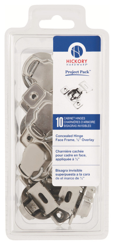 Product Name: Project Pack Bright Nickel Concealed Face Frame with 1/2 In. Overlay (10 pack)Finished: Bright Nickel FinishIncluded: Mounting Hardware IncludedSize Type: Screw Center to Center in Inches: Diamter: Diamension Length in Inches: 2.5Diamension Width Inches: 2.375Diamension Height Inches: 1Weight in OZ: 24Product Type: HingesStyle: ---Finish Name: Bright NickelAppearance Finish: Reflective (Mirror)Color Palette: Silvers/GreysBasic Shape: Geometric/Angular