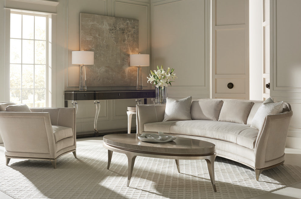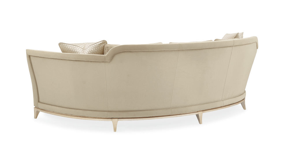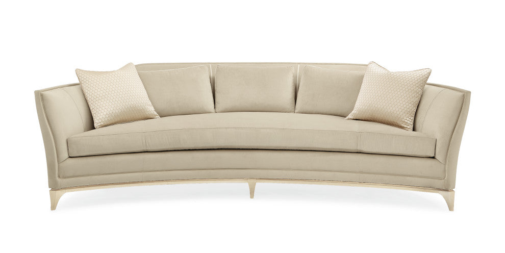 Equally at home in the city or country, this elegant crescent-shaped sofa bends all the rules to create the ultimate in sophisticated seating. Its shapely back and half-moon cushion are accented by a wood base in Soft Silver Leaf. Upholstered in a plush, sumptuous buff shade of velvet with a peek-through seam detail on the inside back and arms and throw pillows in an embroidered satin, this sofa''s sweeping lines and tailored details create a look that is cosmopolitan chic.