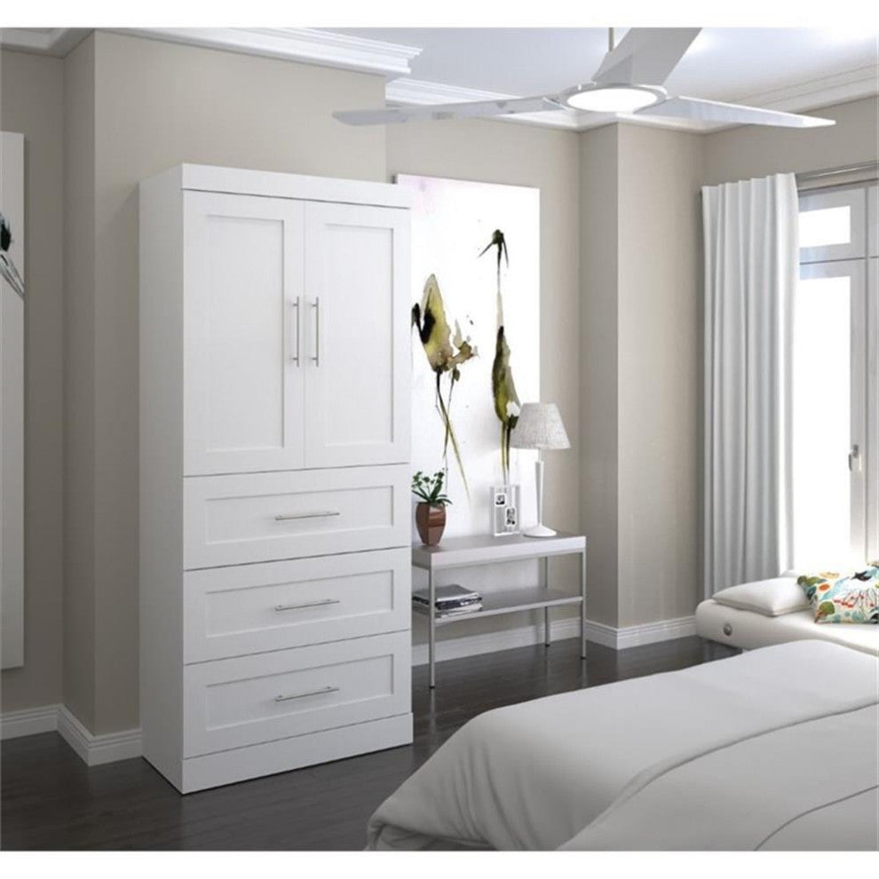 The Bestar Pur 36W Wardrobe with Drawers is a wonderful storage solution for your home. It offers a variety of customizable storage options to meet all your storage needs. Use the concealed shelving to store clothing, storage bins, spare sheets, towels, and more. Or, open the lovely cabinet doors to reveal practical clothing rods to keep your nicest shirts, pants and dresses wrinkle free. You"™ll find the rest of the storage space you need in large drawers opening on smooth ball bearing slides. Add convenient closet storage as well as a touch of style to your bedroom, guest room, entryway or laundry room thanks to this freestanding closet. This accent cabinet can serve as the ideal complement to your Murphy bed or as a stylish and functional standalone storage cabinet. Backed by the Bestar 10 Year Manufacturer''s Warranty.Features: • Bundle includes: 36W Closet Organizer, 2 Door Set for Pur 36W Closet Organizer, 3 Drawer Set for Pur 36W Closet Organizer • Cabinet doors conceal a mix of fixed and adjustable/removable shelves to customize your closet organization • Drawers glide on smooth ball bearing slides for an easy reach to the back • Includes clothing rods to hang your favorite outfits • Can be used for storage throughout your home, including your mudroom, laundry room, or pantry • Shaker-inspired trim and metal handles for transitional styling that complements any decor • Quality engineered wood compliant with TSCA Title VI • Assembly required (2 people recommended) • Backed by the Bestar 10 Year Manufacturer"™s Warranty