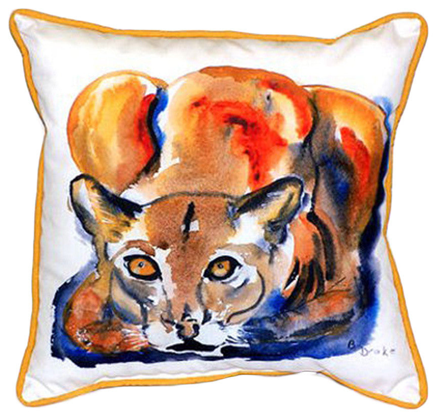 This wonderful Cougar print indoor / outdoor pillow is from Betsy Drake Interiors. Proudly made in the USA, each pillow features a print based on original artwork by artists Betsy Drake and Richard Hamilton. The pillow measures 22 inches tall, 22 inches long, has a 100% polyester cover, which resists fading and wear, giving you years of use, and features a zipper that allows you to remover the polyfill insert, so you can launder the cover. It''s made in the U.S.A, and makes a great gift.