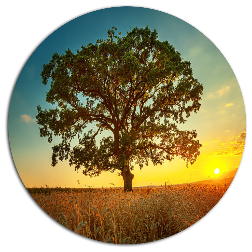 Big Green Tree In Summer Field, Modern Trees Round Metal Wall Art, 11"