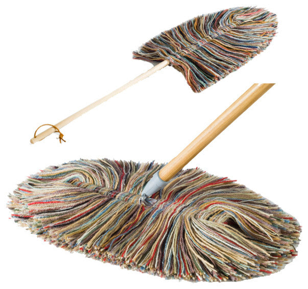 Colorful genuine wool dust mop with 48" handle. Draws dust like a magnet and releases it with a shake. Swivel connector makes easy cleaning of floors; and under furniture easy to access. The hand duster gets every fleck of dust with a 10" fluff of premium quality wool, secured with a VELCRO brand fastener, for easy removal and laundering. Flexible head gets into the corners, along the tops, and into the cracks. It comes complete with a 18" hardwood handle with hang-up hole on the end. Made by a fourth-generation family business in Vermont.This wool mop and duster have all the abilities of a sweater to attract dust and lint, and naturally occurring lanolin in the wool will hold dust and release it without sticking and clogging. After a big job, take the mop outside, give it a shake and it''s ready for reuse.