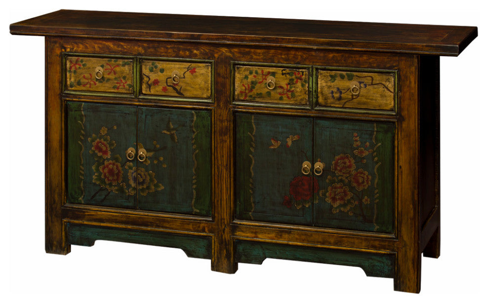 Dimensions:63"W x 16"D x 33"H• Material: Solid elmwood• Brass hardware• Painted by hand• Distressed finish applied by hand, please allow variance for each one• Removable shelving• Fully assembled• White glove service availableWith its distinctive form, this beautiful Tibetan cabinet is an eye-catching work of art. The cabinet features a classic Zen overhanging top and hand-painted bird and flower motifs on its drawers and door panels. Two spacious double-door compartments come equipped with a removable shelf, while four additional top drawers provide ample storage space. Matching brass pulls complete the overall design. Crafted from solid elmwood using traditional joinery techniques, this cabinet is built for long-lasting durability. The cabinet''s rustic yet colorful design of green, yellow, and orange will add a touch of color to any room it is placed. It is perfect as a media cabinet in the living room, a buffet cabinet in the dining room, or a sideboard in the bedroom.