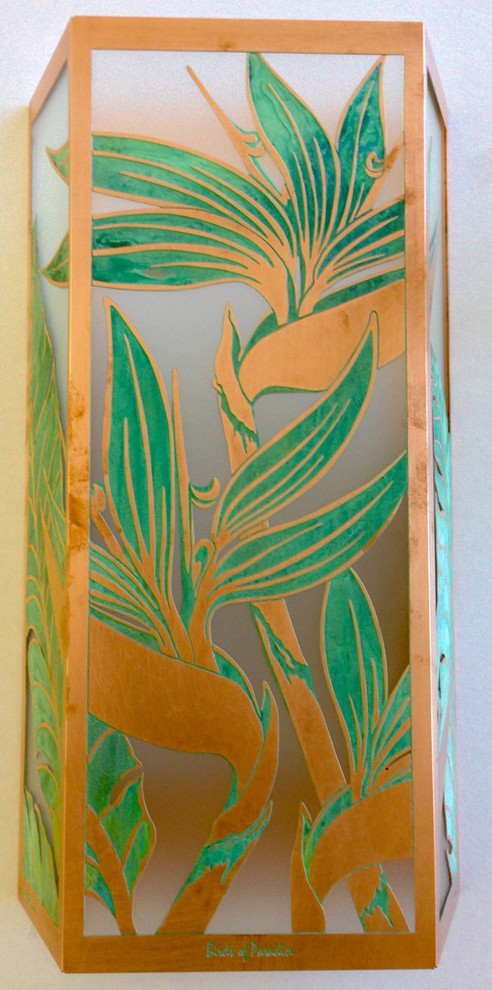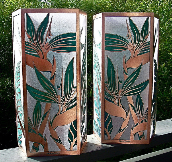 Many believe that there is no tropical flower as stunningly beautiful as the Bird of Paradise. This flower is often the symbol of Paradise and is found throughout the Hawaiian islands. The sconce is made in Hawaii by local artist Leighton Lam. The sconce is made of solid copper with Japanese high-strength etched glass. The patina finish is hand painted with a green verdigris (patina) detailing. All lighting comes with a lamp holder and cover. Paradise Lights come complete, ready for easy installation. They can be used as interior or exterior wall mounted fixtures, all you need is an electrical line to connect with in your wall, on existing homes would be any wall mounted light, on a new construction be sure your architect / electrician plan for a power line to the area you want your lights. The lamp holder will take a standard bulb 40-120 watts.