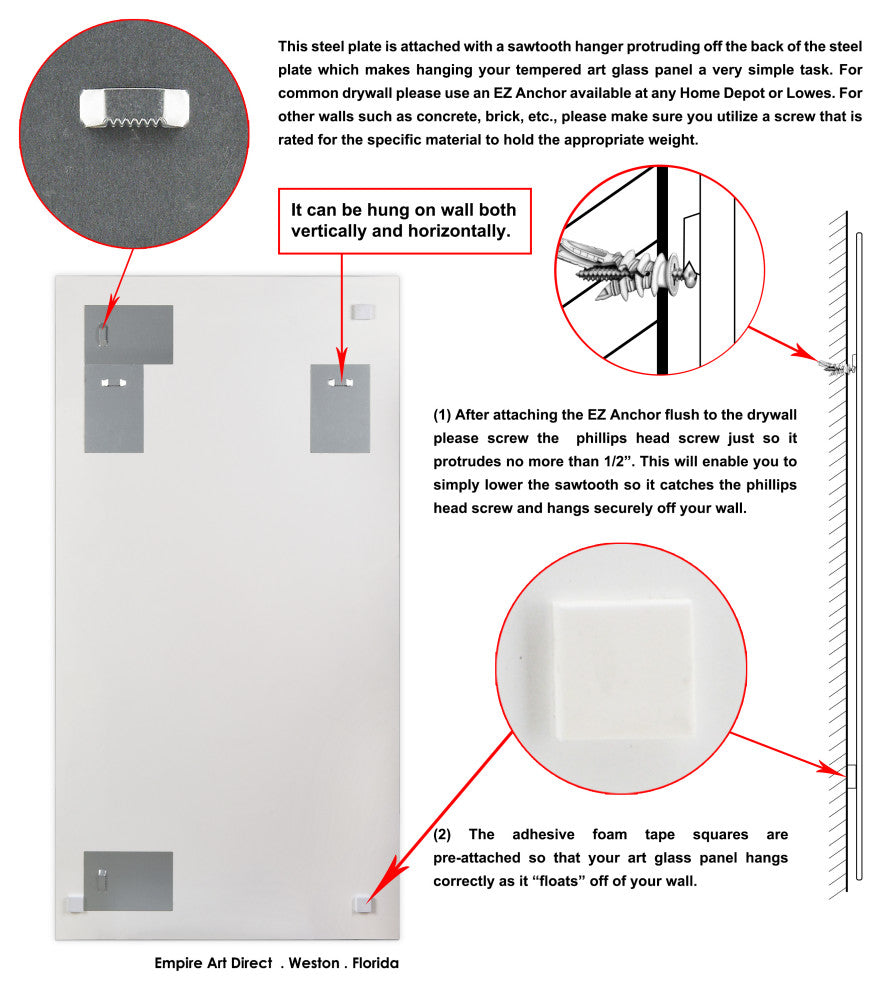 Empire Art Direct"™s collection of printed, frame-less, free floating, tempered glass was inspired by the French technique of Verre Eglomise in which artist''s literally painted the back of clear glass so that when viewed from the front the painting is brought to life under the depth of the glass. This incredible piece by Sharon Chandler takes that same tempered glass and displays a beveled mirror, centered in front of a beautiful black and white abstract. 4 strong steel hangers are attached to the back of the mirror for a quick and easy vertical or horizontal installation.