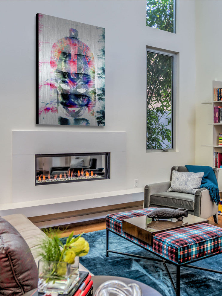 Striking and unique, the "Black Tribal Mask" Print on Brushed Aluminum by Parvez Taj will bring your walls to life. Printed on aluminum, this 30 inch wide by 45 inch tall contemporary artwork will make a statement in any living room, dining room, or bedroom.- Fine art UV ink print on brushed aluminum by Parvez Taj- The aluminum pops the colors and creates an iridescent shimmer, which gives depth to a room- Arrives ready to hang - Includes a certificate of authenticity- Artist signature on the front