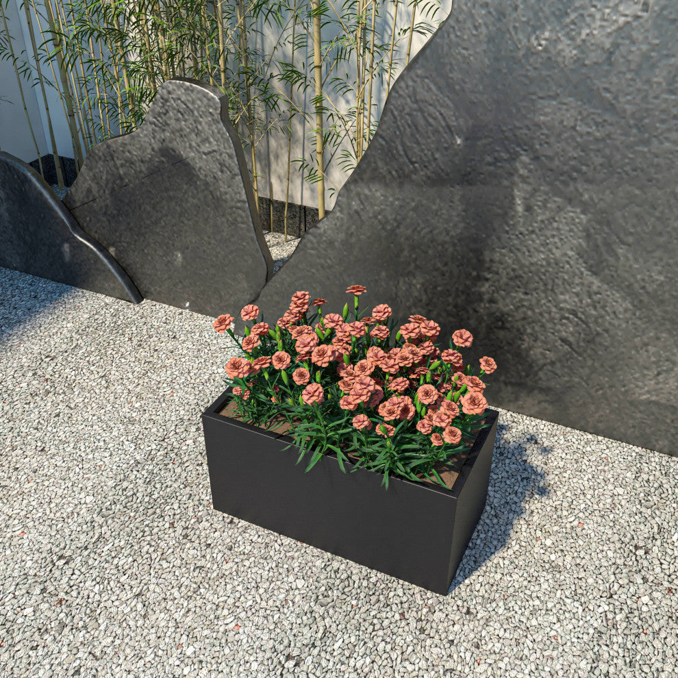 Item Specifications:.Available in 3 sophisticated colors and 3 different size options, this planter provides options to match your personal style or complement existing decor seamlessly. This allows you to curate your botanical display with confidence..Meticulously crafted from a premium blend of fiberstone and MGO (Magnesium Oxide) clay, this planter ensures long-lasting resilience. Its robust construction guarantees it will adorn your space with enduring beauty for years to come..Whether adorning your living room, patio, or garden, this planter seamlessly integrates into any environment. Its versatile design elevates the aesthetics of your surroundings, offering a stylish solution for various spaces..Thoughtfully designed with drainage holes and drill holes, this planter promotes proper water management. Ensuring your plants thrive, it creates optimal conditions for their growth and well-being..Each planter is meticulously handcrafted, showcasing artisanal precision and attention to detail. This ensures a unique and high-quality product that adds a touch of craftsmanship to your space..Engineered to withstand diverse weather conditions, this planter is suitable for both indoor and outdoor settings. Its weather-resistant qualities promise enduring beauty and functionality, making it a great addition to any space..The hassle-free design of the planter ensures a seamless experience with no assembly required. Enjoy the convenience of effortlessly incorporating greenery into your space, enhancing the aesthetic without the need for complex setup.Item Dimensions:.9 Inch: 9" H x 19.7" W x 9.2" D.12 Inch: 11.8" H x 23.6" W x 11.8" D.16 Inch: 16" H x 31.5" W x 16" DItem Description:Immerse yourself in the world of botanical beauty with our exquisite Bloom Planter Pot, meticulously crafted from a resilient blend of fiberstone and MGO clay. The rectangular shape adds a touch of timeless elegance to your space, while strategically placed drainage holes and drill holes ensure optimal conditions for plant growth, making it suitable for both indoor and outdoor use. With a range of three sizes to choose from, as well as three sophisticated color options, this planter allows you to curate a customized display that aligns with your aesthetic preferences and spatial requirements. Elevate your plant arrangements to a new level of sophistication, where form meets function seamlessly in this embodiment of botanical elegance.